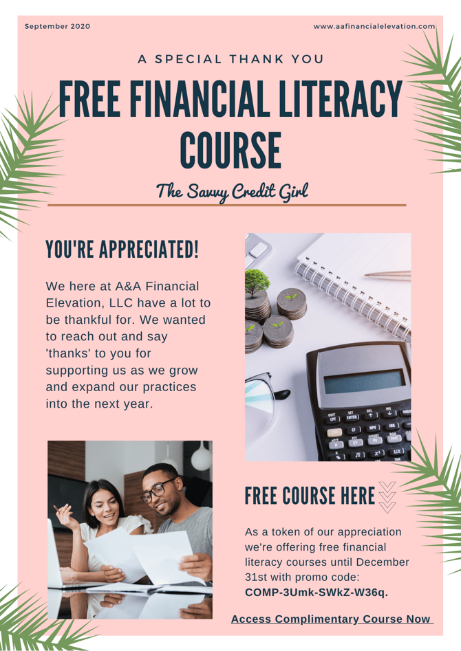 We here at A&A Financial Elevation, LLC have a lot to be thankful for. We wanted to reach out and say 'thanks' to you for supporting us as we grow and expand our practices into the next year. As a token of our appreciation we're offering free financial literacy courses until December 31st.