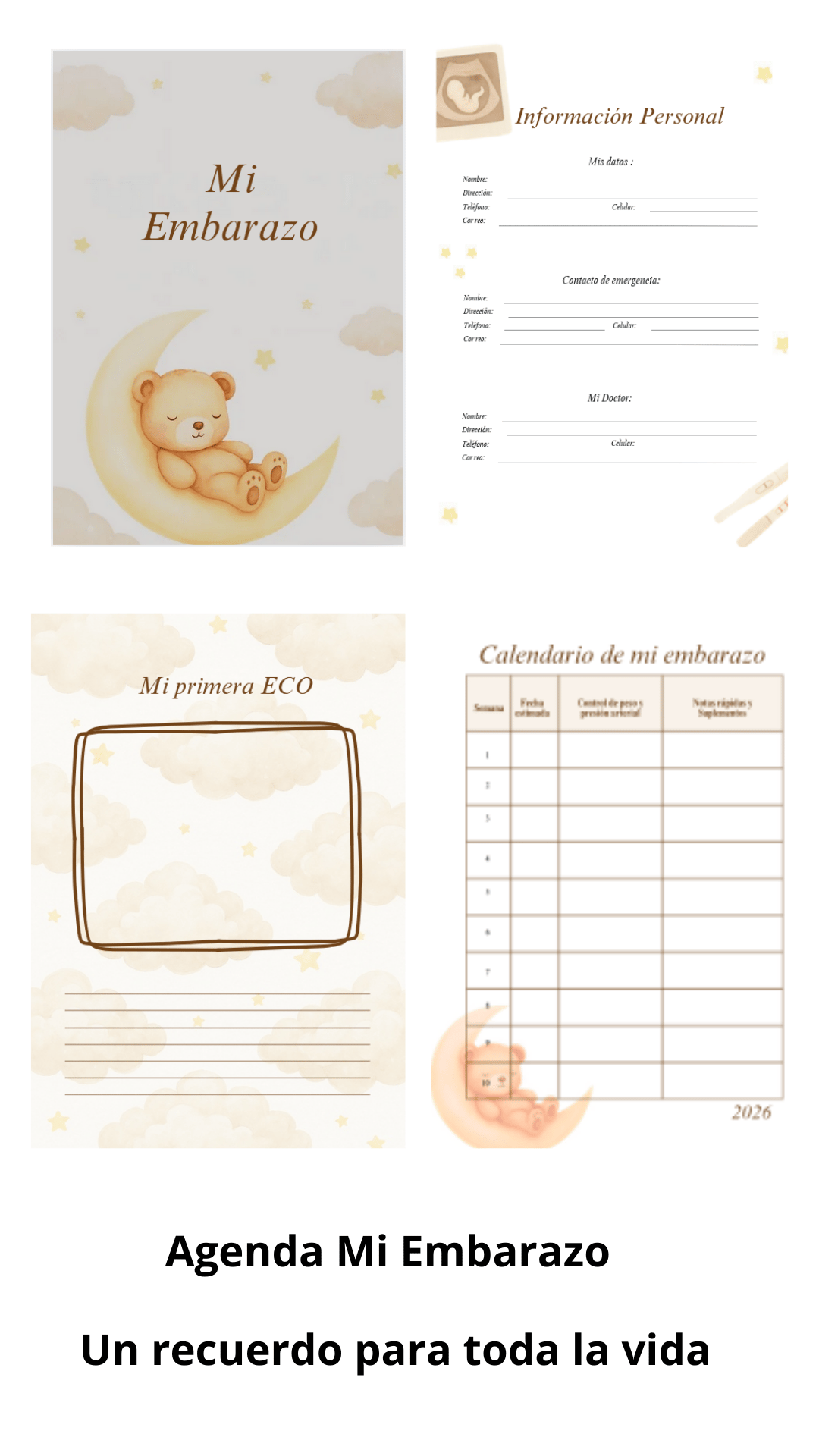 Nuestra Agenda de Embarazo de 190 páginas fue creada para acompañarte semana a semana mientras esperas a tu bebé. Aquí podrás guardar recuerdos, emociones, fotos, citas médicas y todos esos pequeños detalles que hacen única esta etapa tan especial.