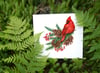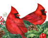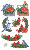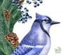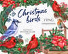 Christmas birds and decoration. Blue jay, red cardinal, robin. Xmas pine garlands.