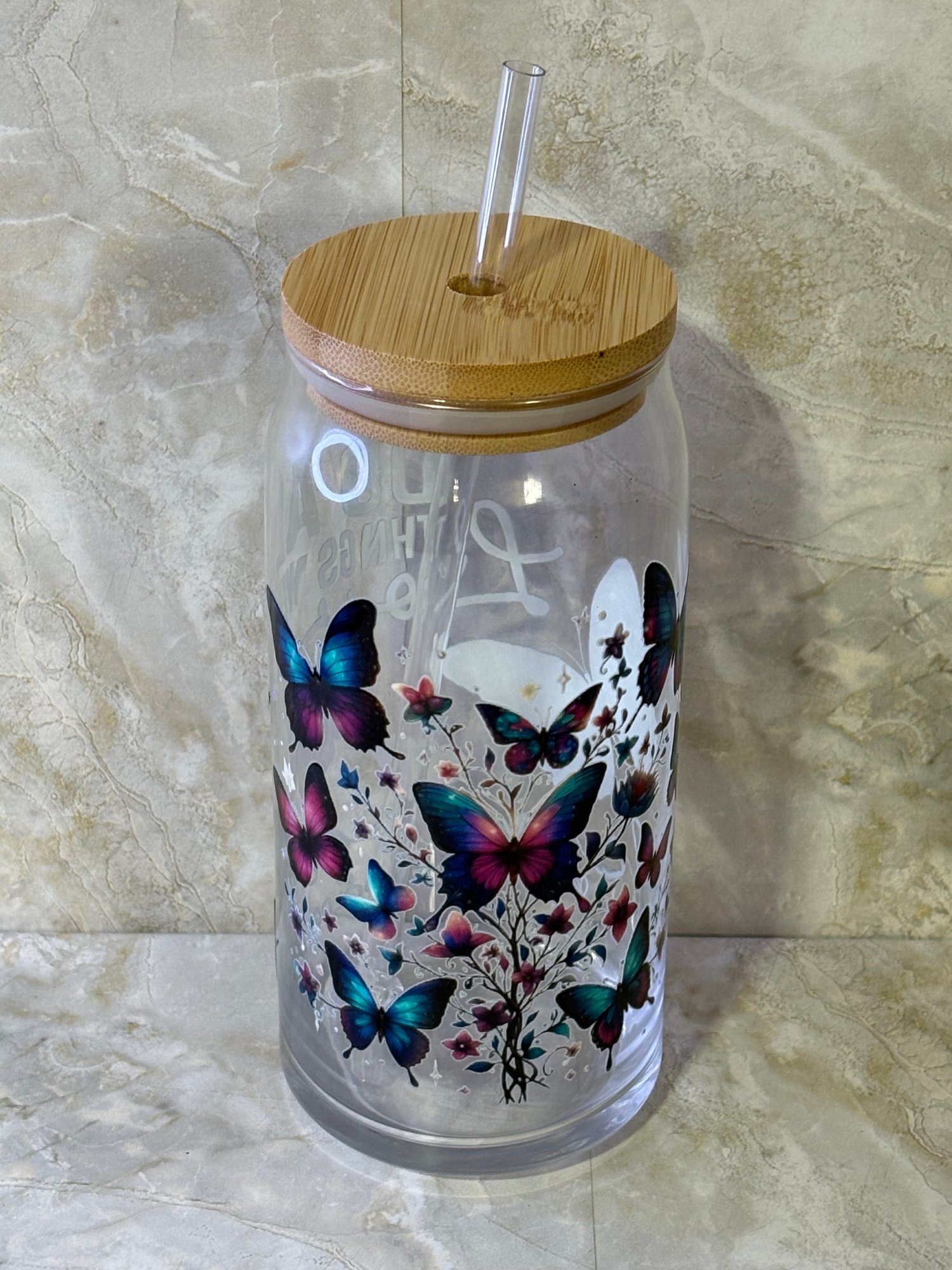 Sip your reminders to live with love. This 16oz glass tumbler radiates positivity with its motivational quote and butterfly accents a perfect daily companion for your water, smoothie, or tea.
