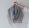 Rasa is an easy and light project. It is knit in bias with a soothing texture and a lace border. Body of the shawl is shaped with regular spaced increases and decreases to create a slanting crescent shape. Lace border is worked in contrasting colour in mohair laceweight yarn held double. The border is formed as an extension from the existing live stitches at the end of main body and by picking up the garter ridges along the left edge of the shawl.