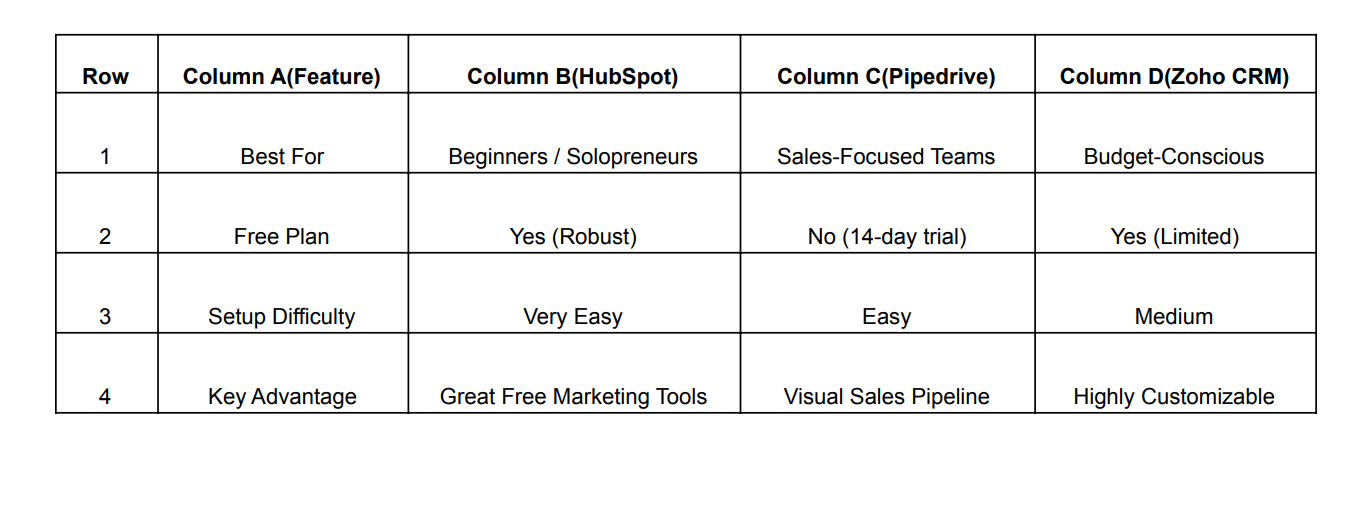 - CRM Comparison Sheet: A side-by-side view of HubSpot, Pipedrive, and Zoho.