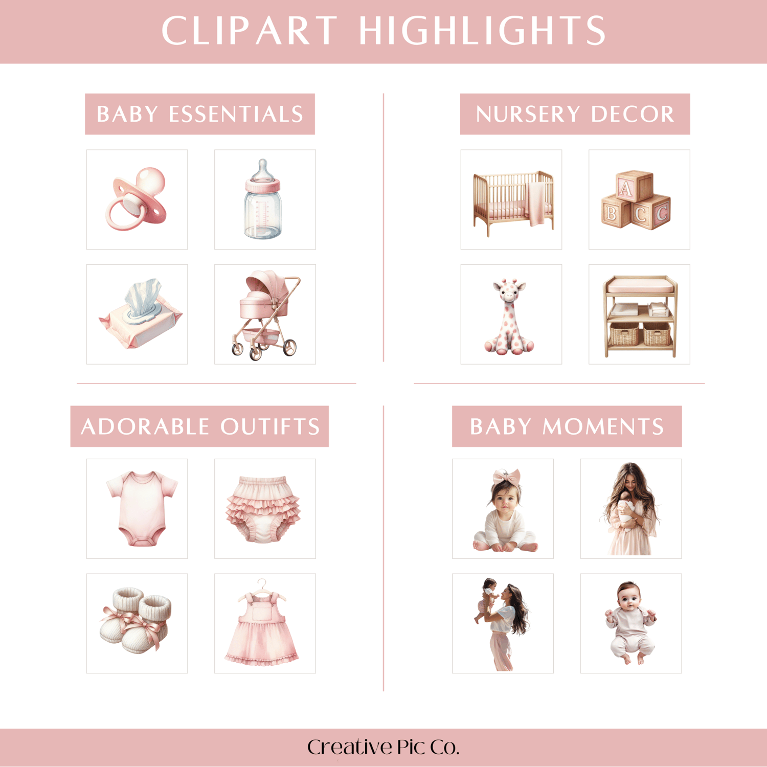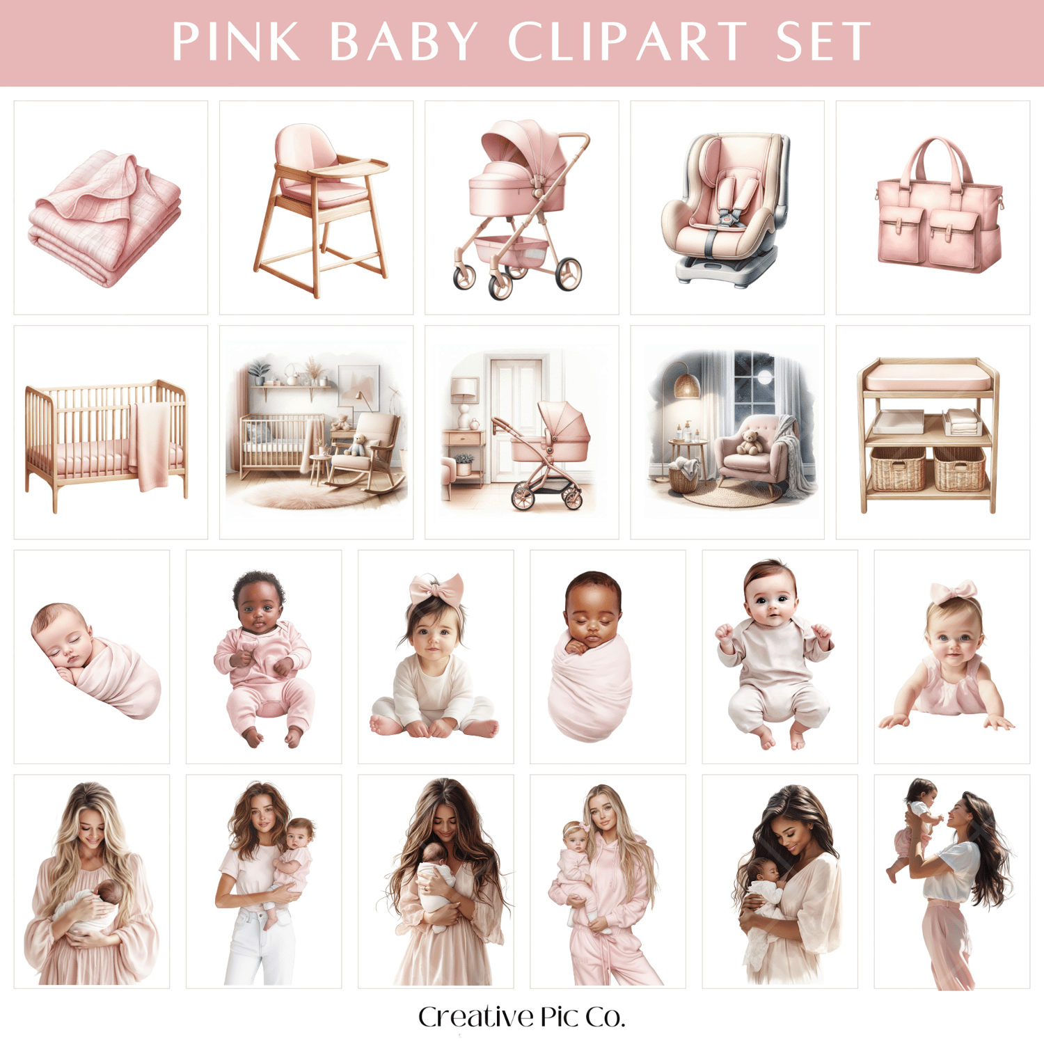 Celebrate the sweetness of early days with this Pink Baby Clipart Collection. Featuring 42 high-resolution PNGs, this set includes prams, rattles, toys, clothes, bottles, nursery furniture, and adorable baby characters with mothers and children. Designed in a soft watercolour aesthetic, this collection is perfect for baby shower invitations, birth announcements, nursery wall art, planners, journals, and feminine branding projects.