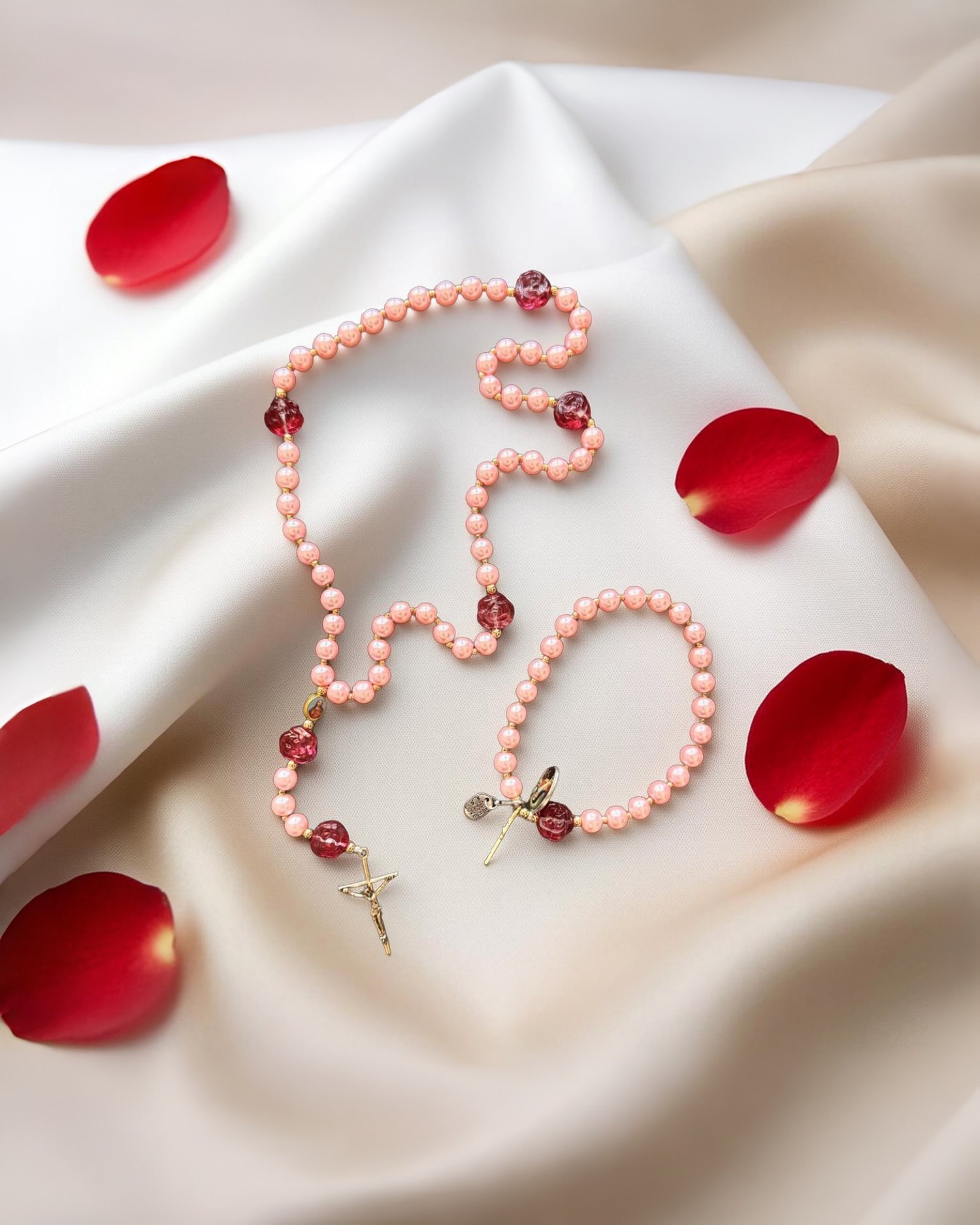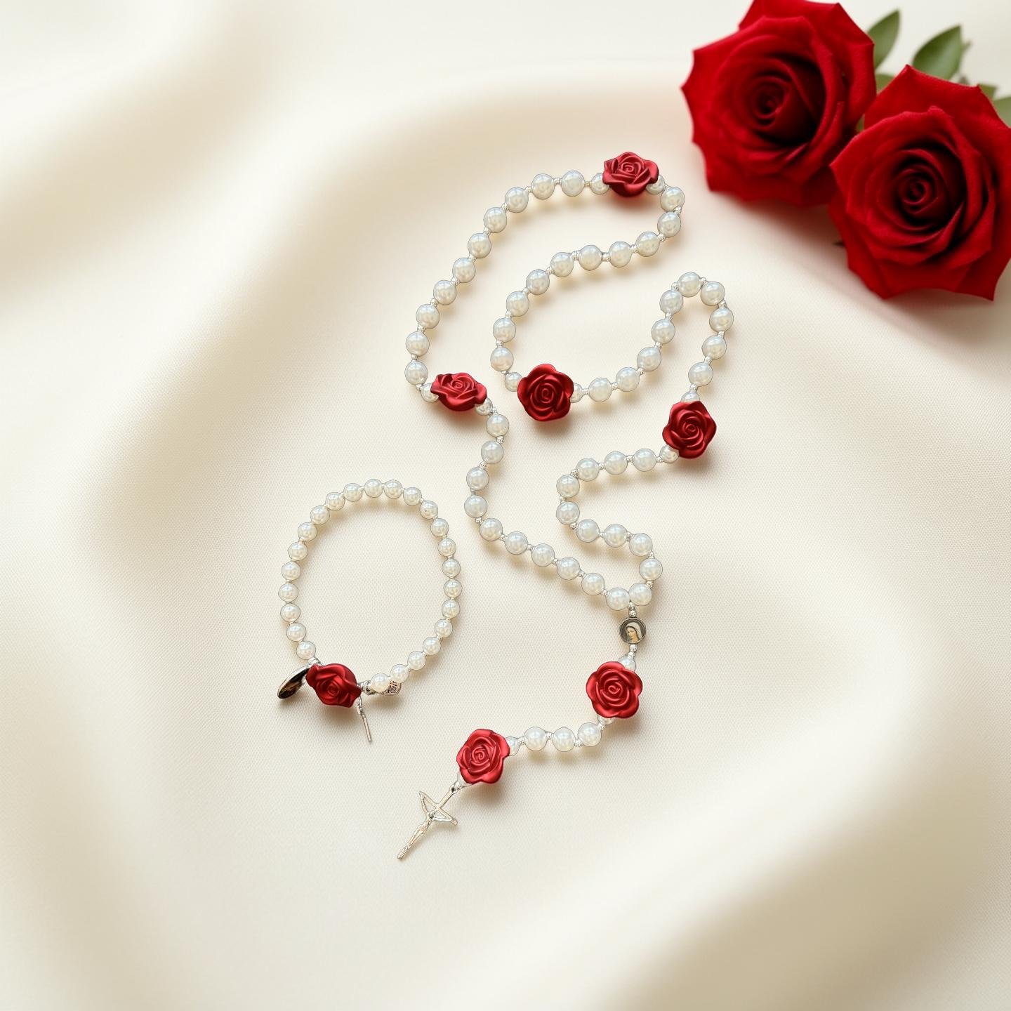 Set 3 – Pearl & Roses (White Pearl with Red Roses) Classic white pearl beads are beautifully complemented by sculptural red rose accents, creating a timeless piece that honors both purity and passion. Perfect for those who appreciate traditional beauty with a romantic twist. Paired with a matching 24-bead St. Thérèse bracelet.