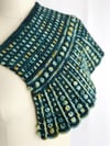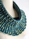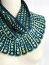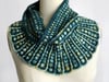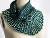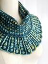 The upper section is a simple polka dot linen stitch, followed by a band of puff stitches. The lower section is separated into polka dot linen stitch in the back with the “bejeweled” bib in the front. Increases are worked into the bib portion, so the “jewels” get larger as you work downward, which gives the cowl its flared shape.