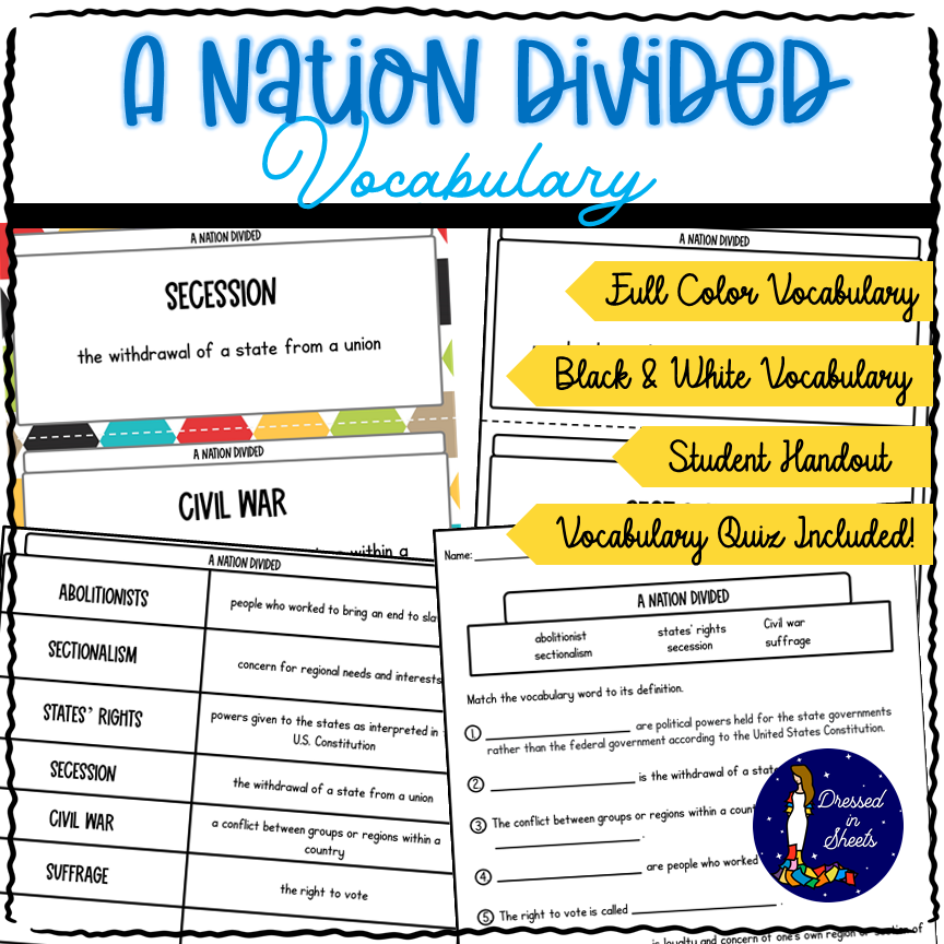 Students will learn new vocabulary words related to A Nation Divided, review them with the handy dandy student version included, and get quizzed on the vocabulary words. This will prepare your students for quizzes, exams, and reading historical documents. Bridge the gap with this awesome vocabulary pack!