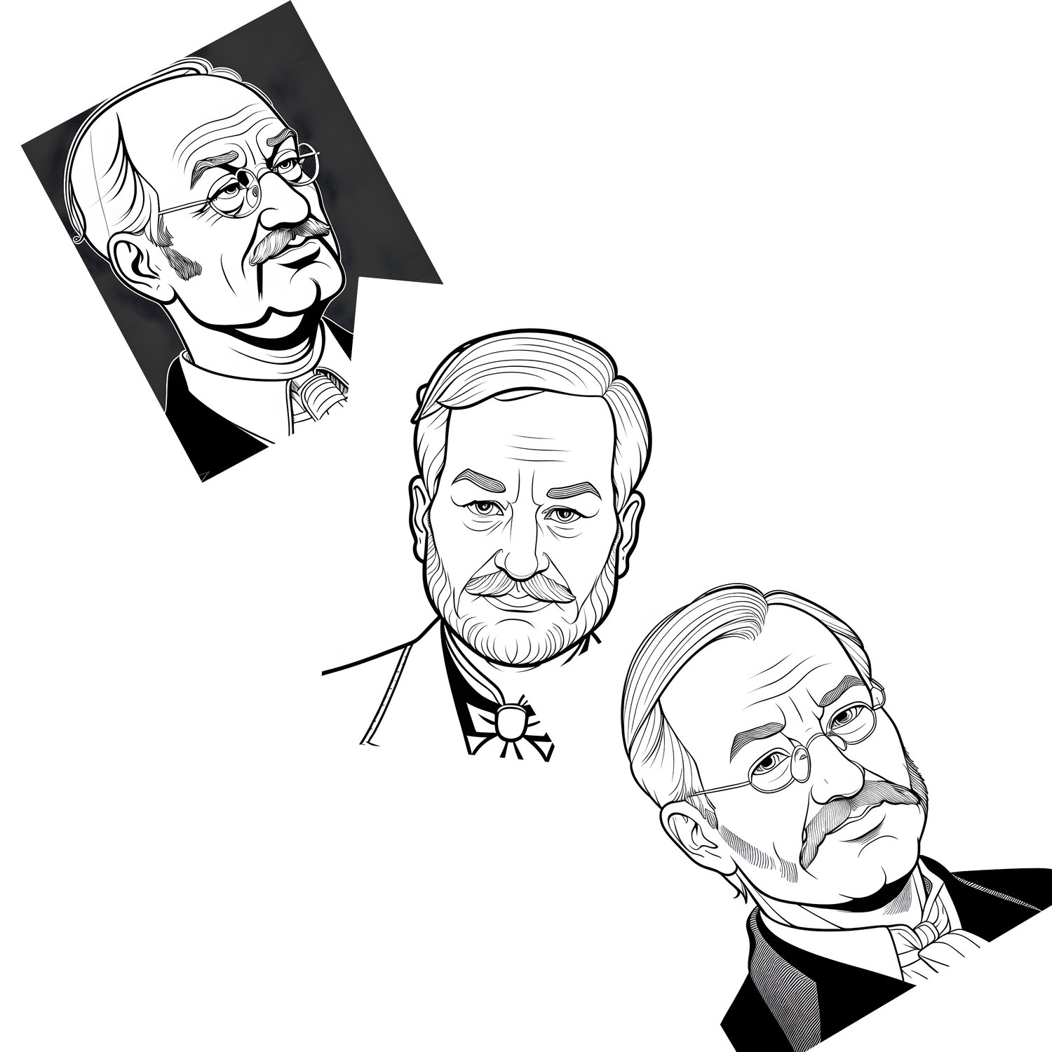 This collection features three high-quality digital illustrations portraying the founding fathers of psychoanalysis: Sigmund Freud, Carl Jung, and Alfred Adler. Each portrait is rendered in a distinctive black and white style with bold lines and intricate shading, capturing the essence and personality of these influential thinkers. The illustrations highlight the subjects' most recognizable features, such as Freud's glasses and mustache, Jung's full beard, and Adler's thoughtful expression. These artworks are perfect for psychology enthusiasts, students, or professionals looking to add a touch of intellectual history to their space.