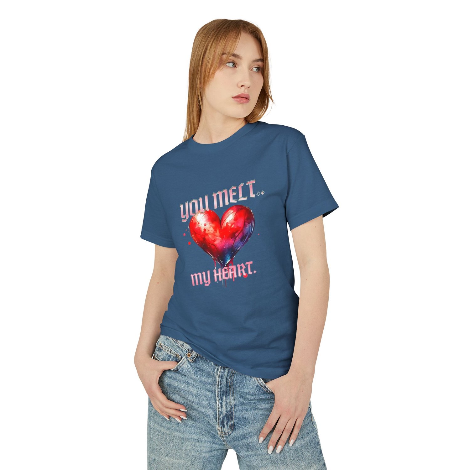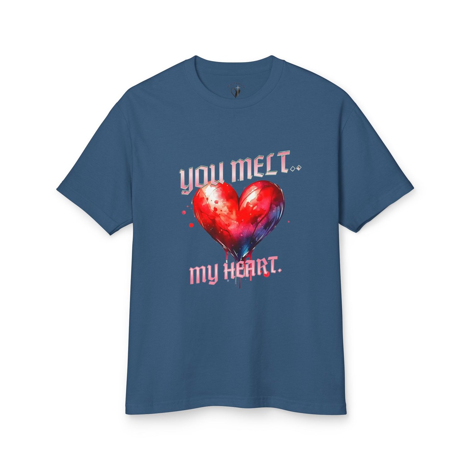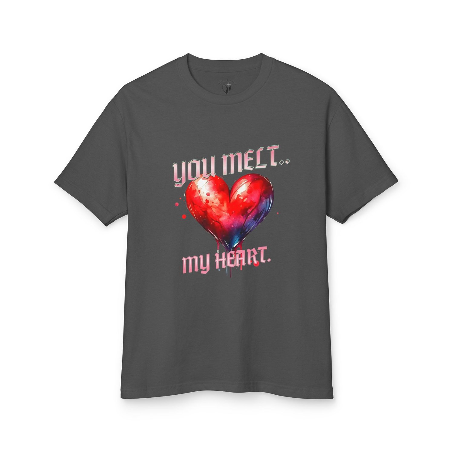 A unisex heavyweight cotton Tee featuring a melting heart design with the quote 'you melt my heart'. This Tee gives off a sweet and romantic vibe, making it a perfect gift for Valentine's Day, anniversaries, or just to show someone you care. It is relevant to anyone looking for a comfortable and stylish graphic Tee.