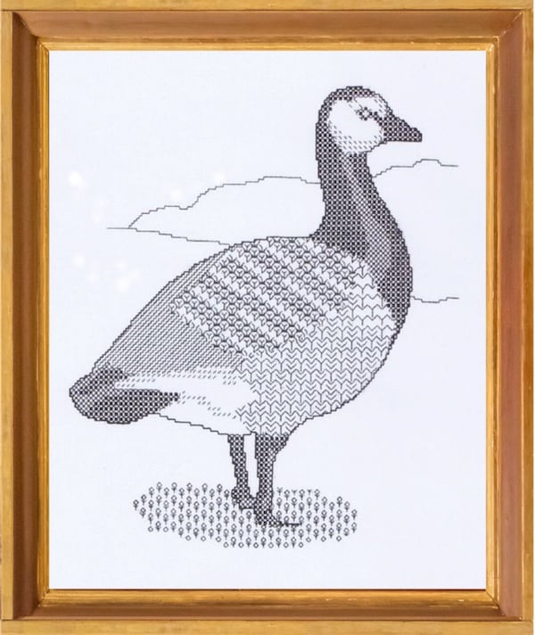 Inspired by the barnacle goose’s crisp mask and patterned back, the design uses varied blackwork fills to sculpt light, shadow, and the soft layering of feathers. The background is deliberately left unstitched, so the negative space reads as fresh tundra. A nod to old folklore—when people believed these birds sprang from sea barnacles because no one saw their northern nests—adds story and charm to your stitch.