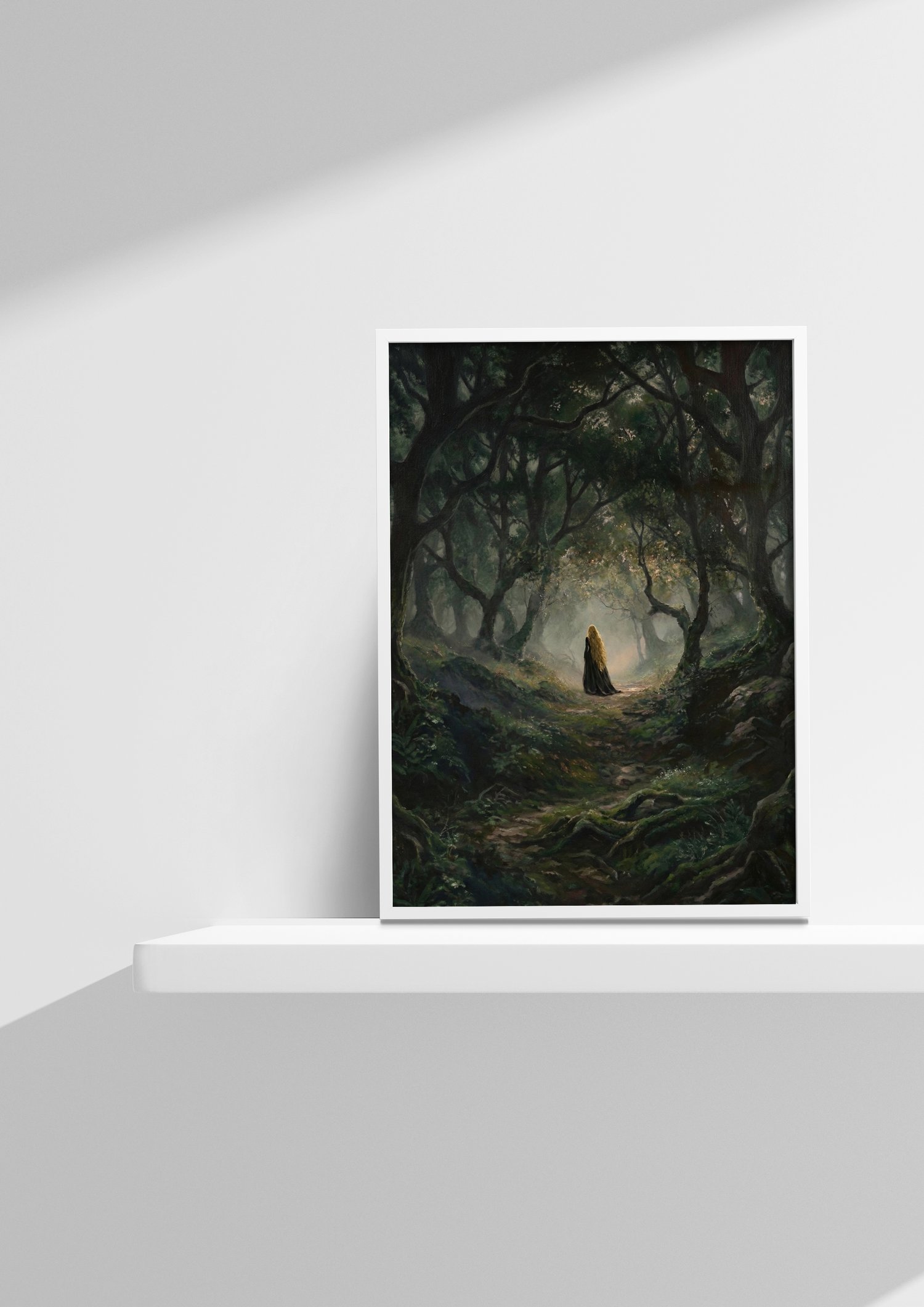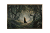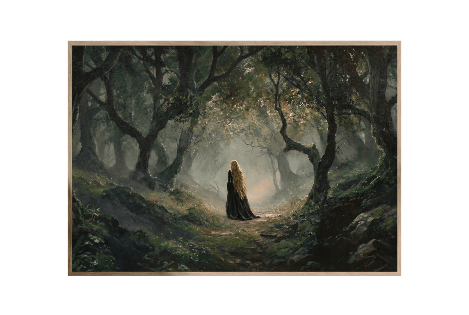 Beneath a canopy of twisted boughs and moss-laden giants, a lone figure enters the hush of an ancient forest. Light gathers in soft, spectral fragments, illuminating her path as though the woods themselves are watching — guardians older than stone, older than memory.