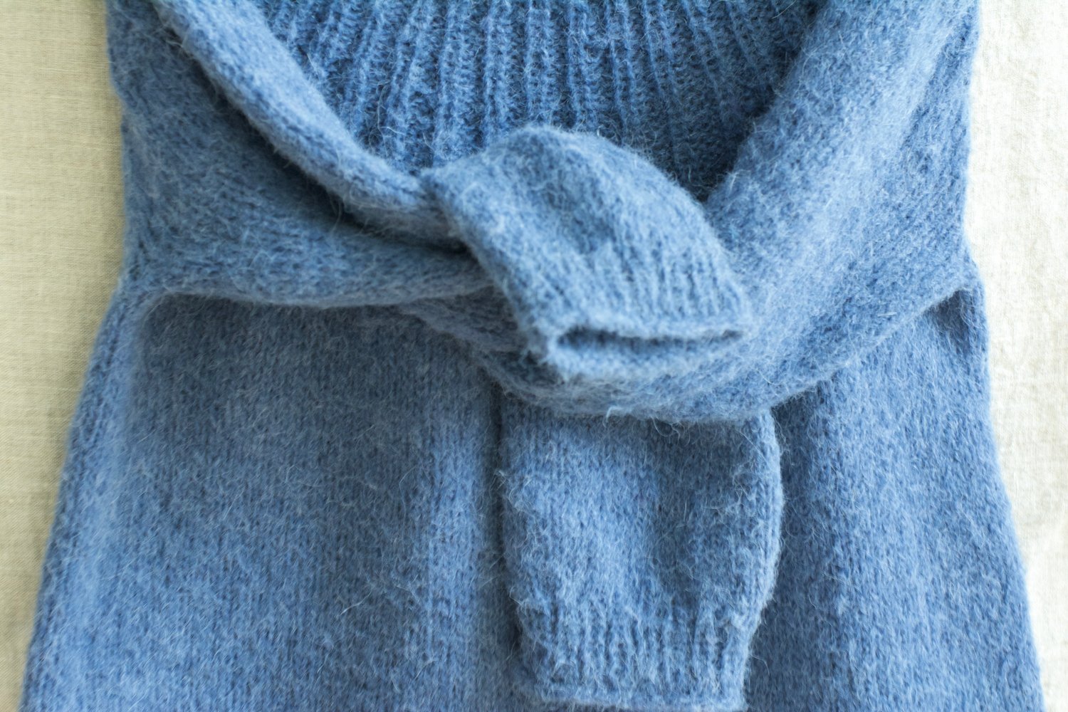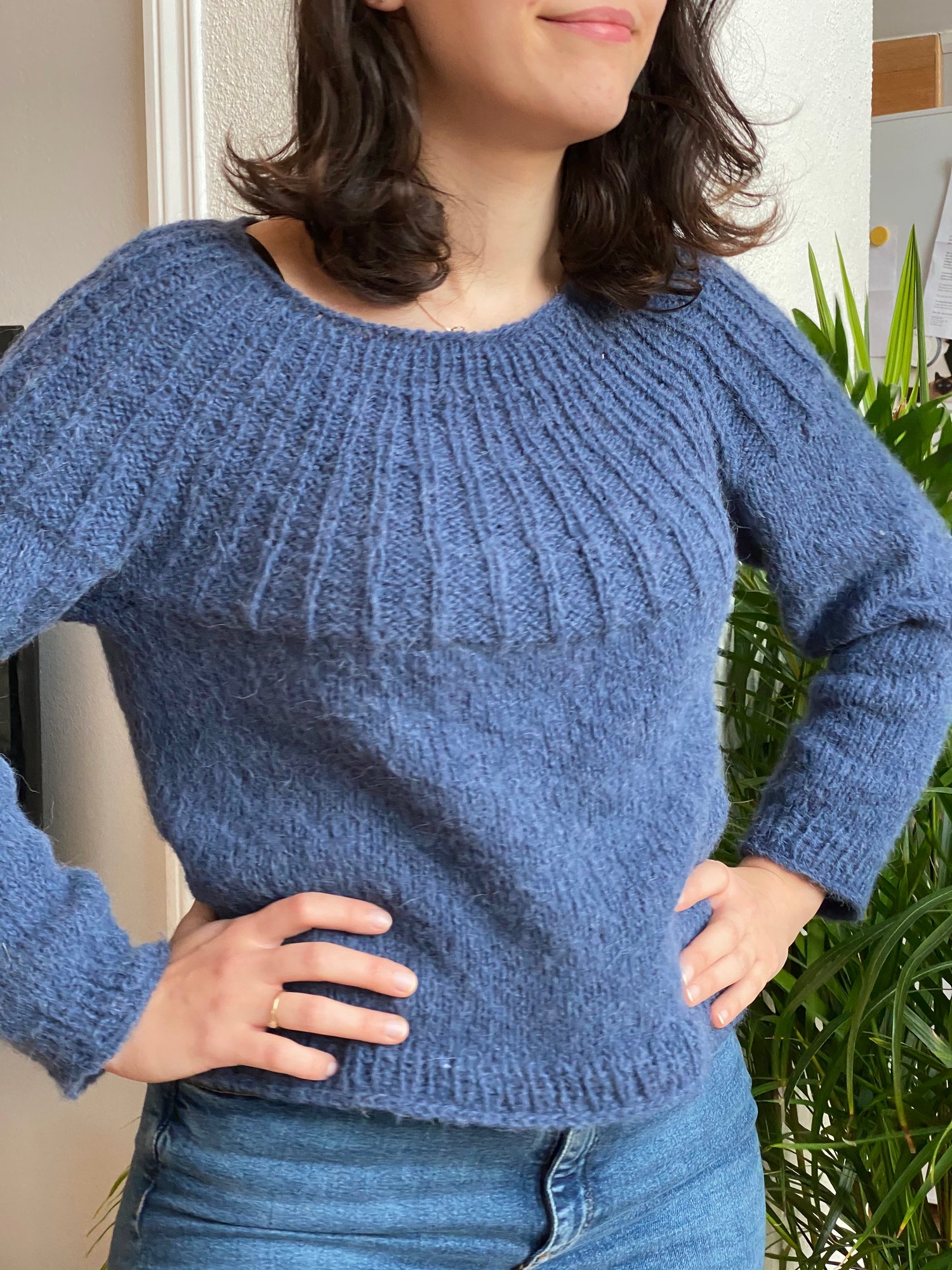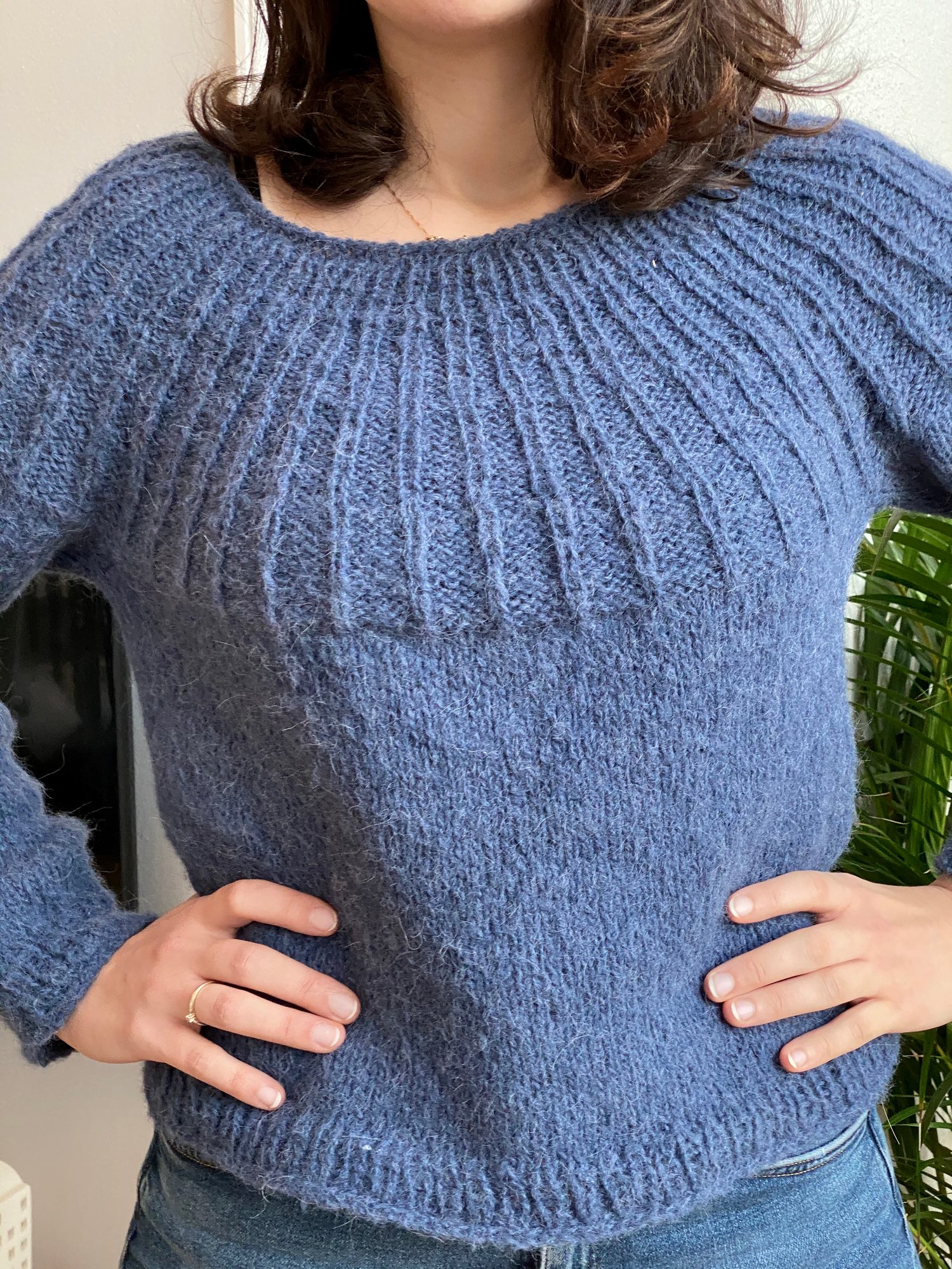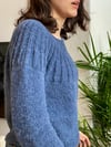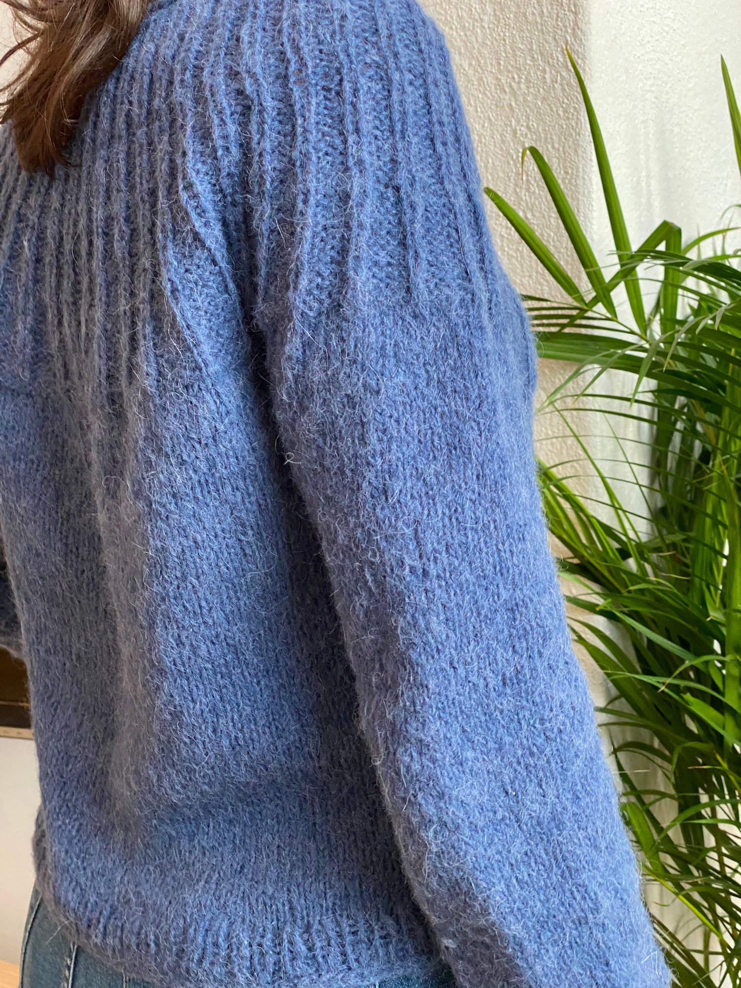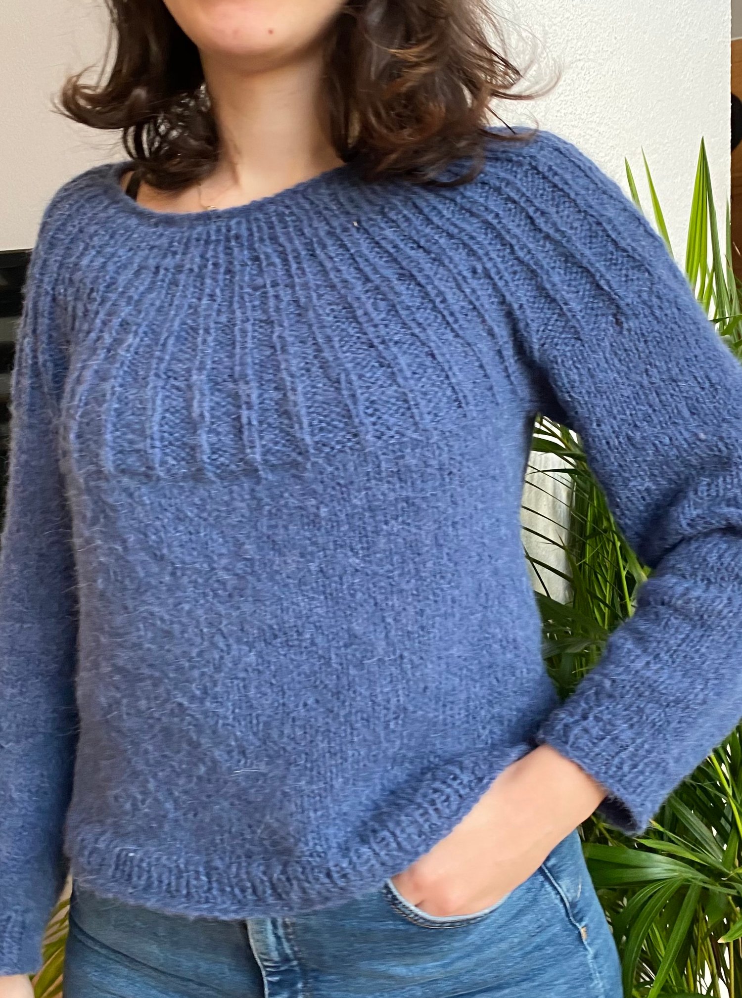 This basic top-down knitted jumper features a seamless ribbed yoke worked in the round in rib and shaped with a increases. Back of the jumper is risen up with a couple of Short Rows to shape maximal comfortable fit. Body and sleeves are worked in Stockinette stitch and finished with few rows 1x1 rib. The sleeves on The Blue Star jumper are bracelets long and worked with decreases. The