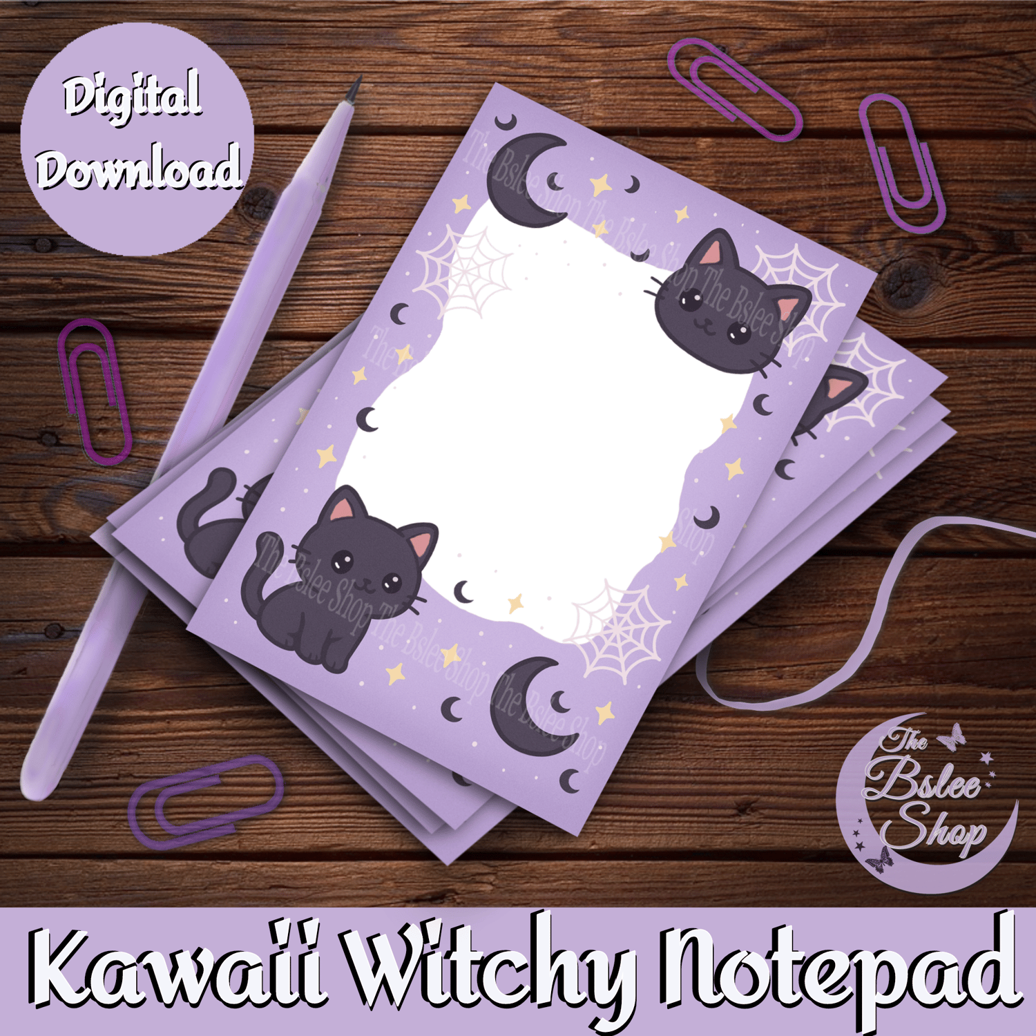 Kawaii Purple Witchy Notepad Pages, Printable Cute Cat Spooky Memo, Black Cat Stationery, Halloween Paper Crafts, Kawaii Purple Journaling