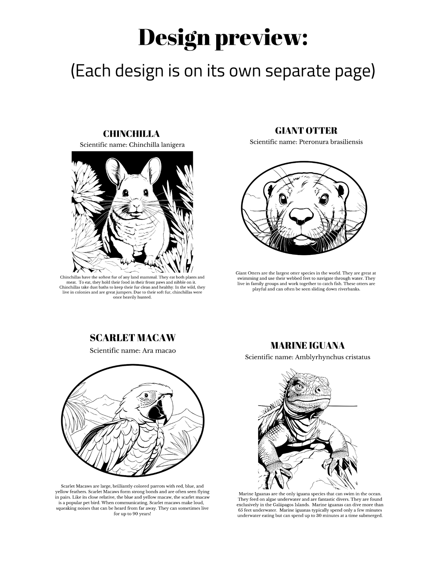 Using our "Exploring South American Wildlife" coloring book, take a vivid trip through the fascinating regions of South America. With 20 intriguing pages featuring detailed images of the most remarkable animals in the area, this downloadable educational coloring book is perfect for inquisitive minds and artistic hands. Ignite curiosity and knowledge with fun facts about South American animals. From the stealthy jaguar to the charming capybara, the elusive blue poison dart frog to the leisurely three-toed sloth, each page is a gateway to discovery. Encounter a kaleidoscope of wildlife, including the majestic giant otter, the resplendent blue and yellow macaw, the ancient Galápagos tortoise, the sleek marine iguana, and the adorable alpaca, chinchilla, and llama. This coloring book is a celebration of South America's rich biodiversity. Access the coloring book instantly and print as many copies as you'd like. Perfect for home, schools, or group activities, ensuring hours of entertainment and learning for kids. Unleash the imagination, color the wild, and discover the wonders of South American wildlife with "Exploring South American Wildlife: A Printable Educational Coloring Book for Kids." Download, print, and let the adventure begin!