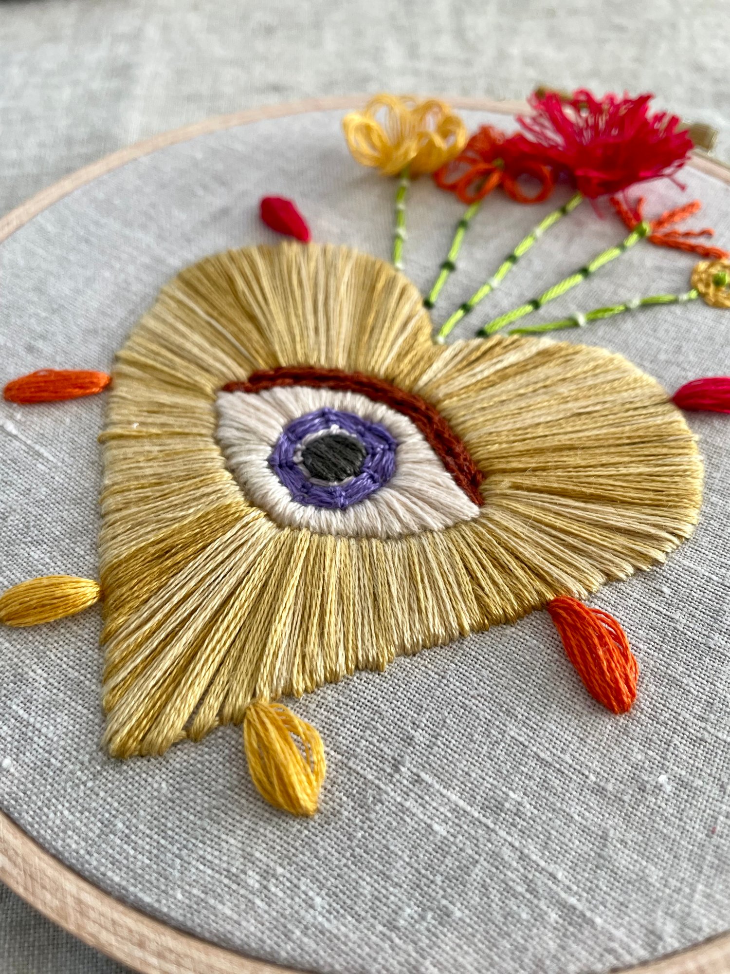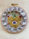 Embroidery of a milagro in gold with a violet ojo and textural flowers. Designed and embroidered by me February 2022. To keep from fading be sure to not place in direct sunlight.
