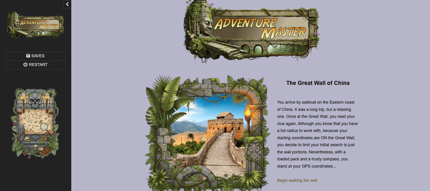 You find yourself stumbling across the Quest Adventure Society, an underground society responsible for creating adventure across the globe, and desire desperately to become a member of the team. They don't accept new members so readily, though. You're tasked with finding 50 treasures hidden all over the world. You'll go from location to location in a treasure hunt fashion to find each treasure and only way to continue on your adventure will be to correctly answer trivia questions on a variety of topics that Jones and Drake would likely know. With numerous randomizers utilized, there are literally trillions of possible combinations of locations and trivia questions possible to find each treasure.