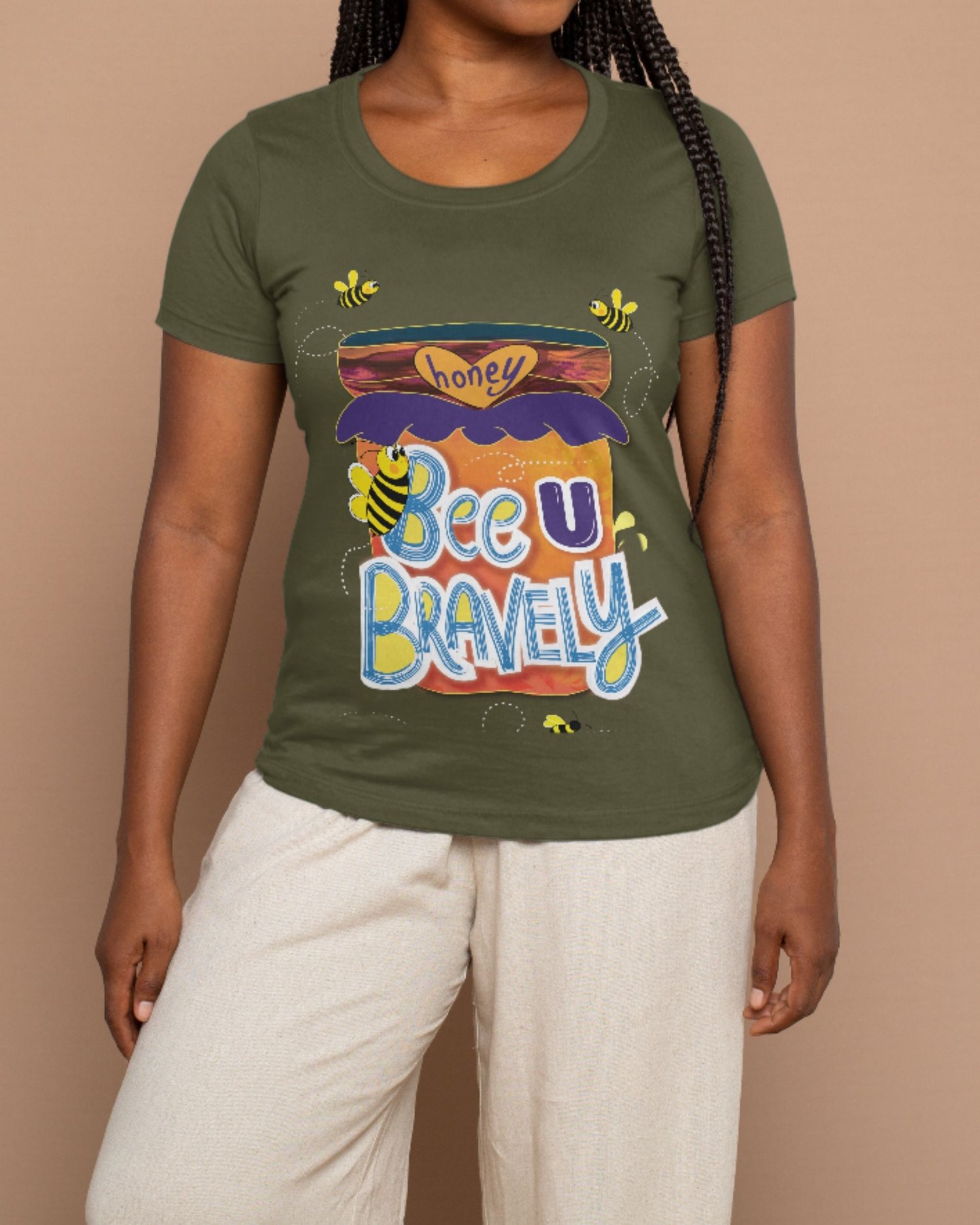 This punny bee t-shirt shows buzzing bees circling around honey jar with a cute pun on the jar.