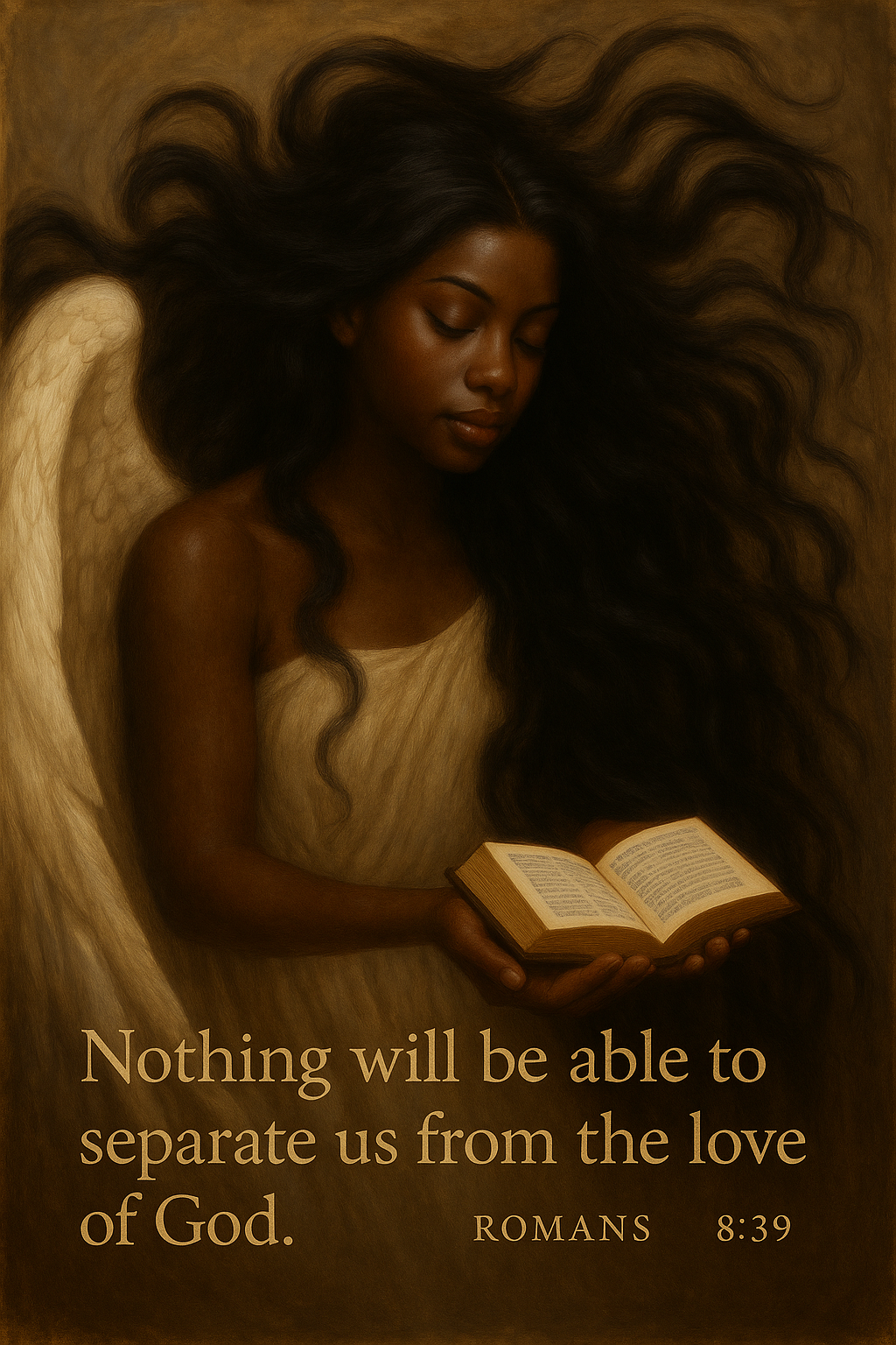 Let peace and divine love fill your space with this angelic scripture poster, featuring a serene winged figure holding an open book and the timeless promise of Romans 8:39:
