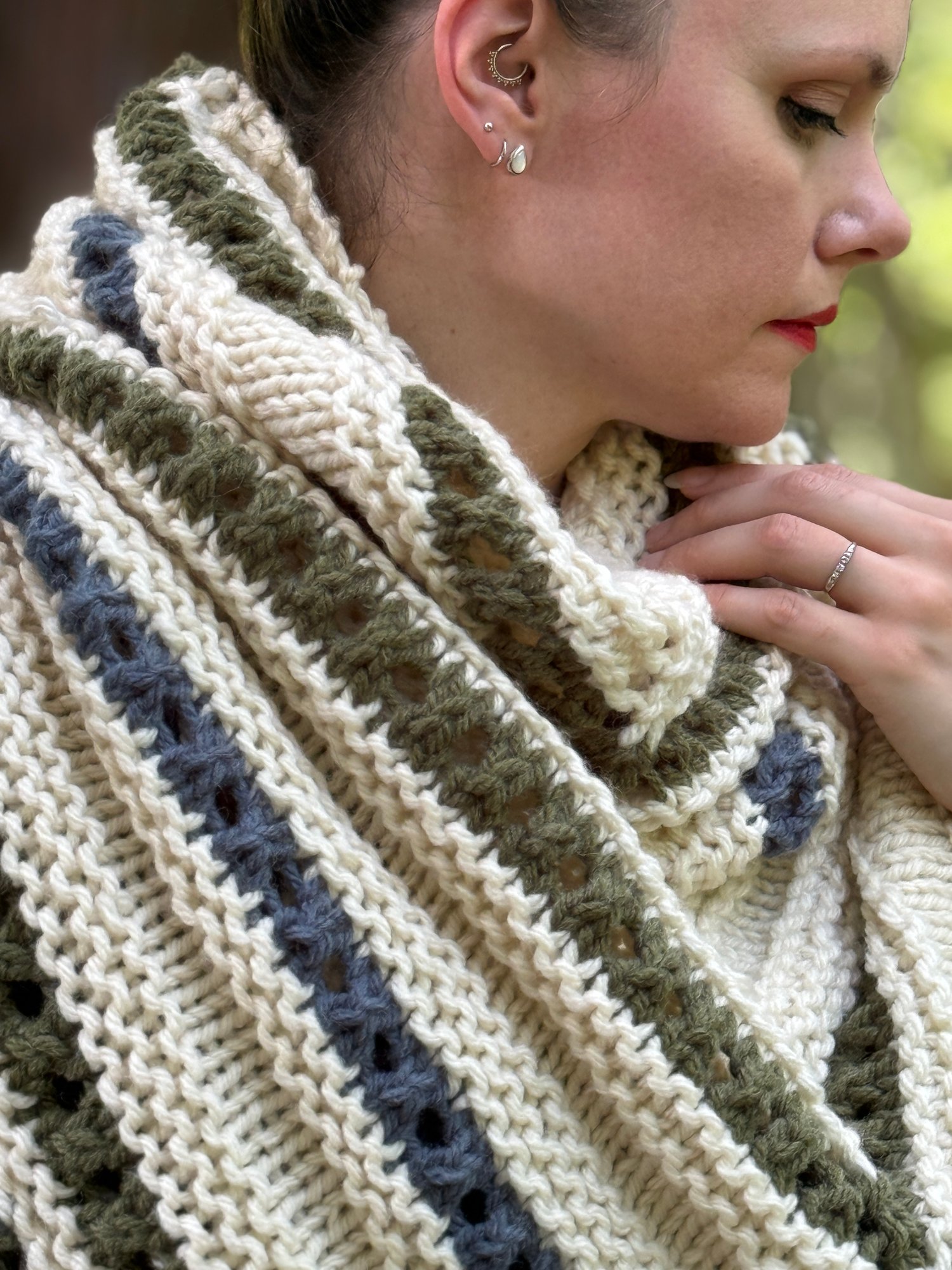 Bulky weight yarn; 495 yds/453 m total without fringe; 13 oz/361 g MC: 375 yds/343 m, CC1: 50 yds/46 m, CC2: 70 yds/64 m