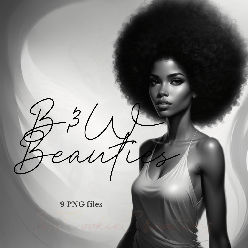 Celebrate the beauty and power of Black women with our B&W Beauties collection. This set includes 9 high-quality PNG images of stunning Black women, each featuring bold and captivating afros. These images are perfect for a wide range of creative projects—whether it's for commercial use, personal artwork, or digital designs.