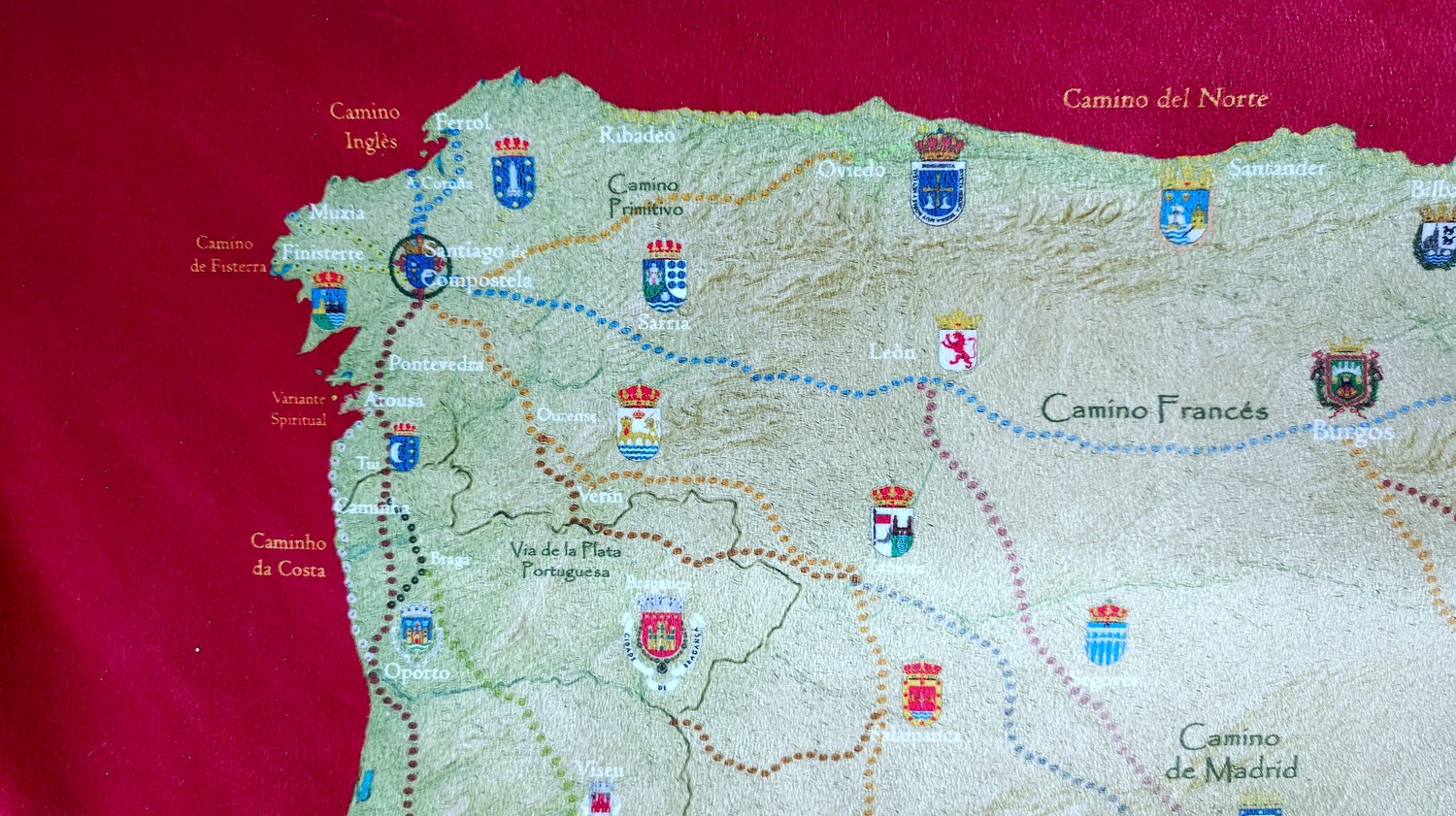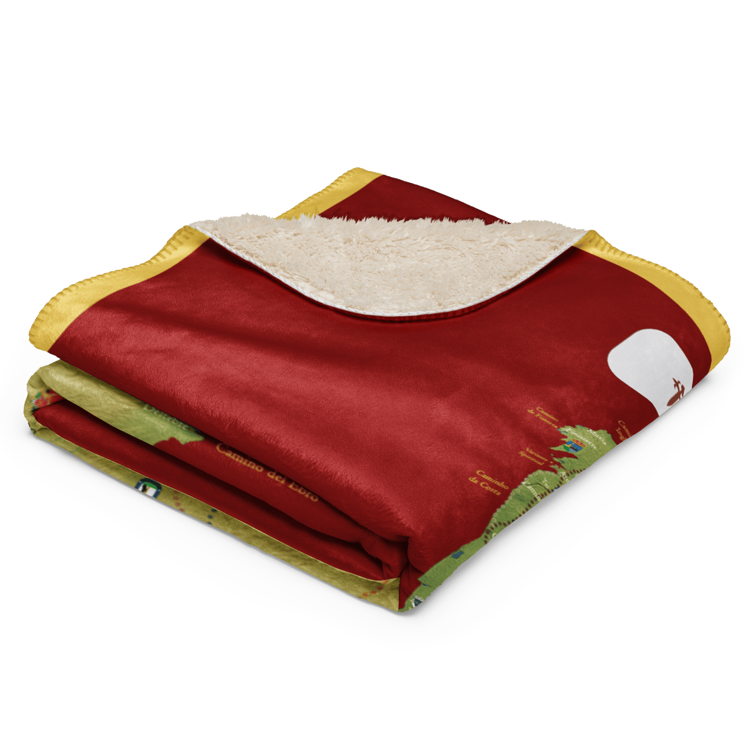 Unisce il comfort del lato sherpa e sul lato opposto una mappa finemente dettagliata di tutti i percorsi del Cammino di Santiago stampata su tessuto pelo-gatto.