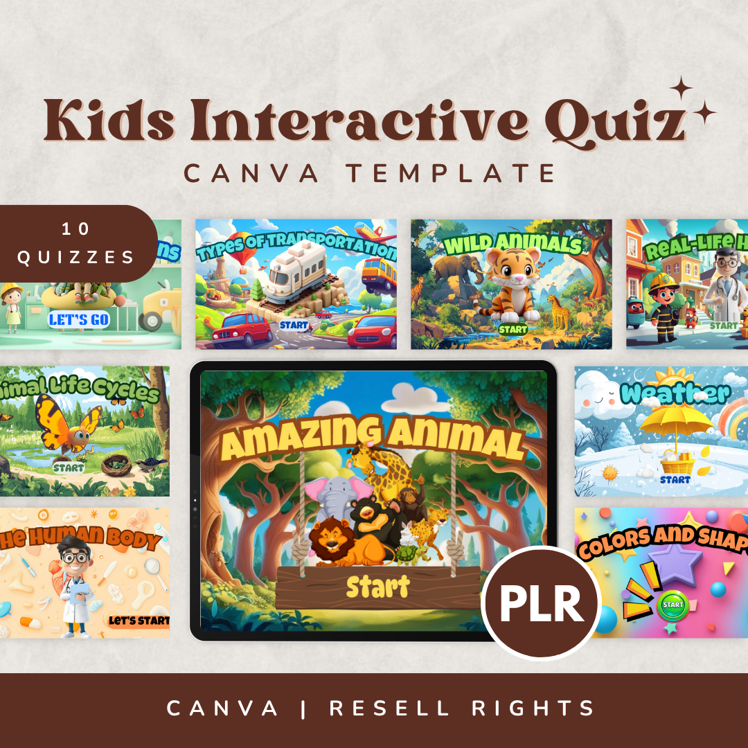 10 Kids Interactive Quiz Game, Educational, PLR, Editable in Canva, Animated