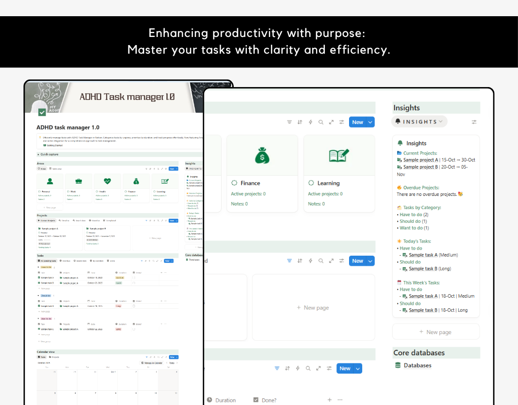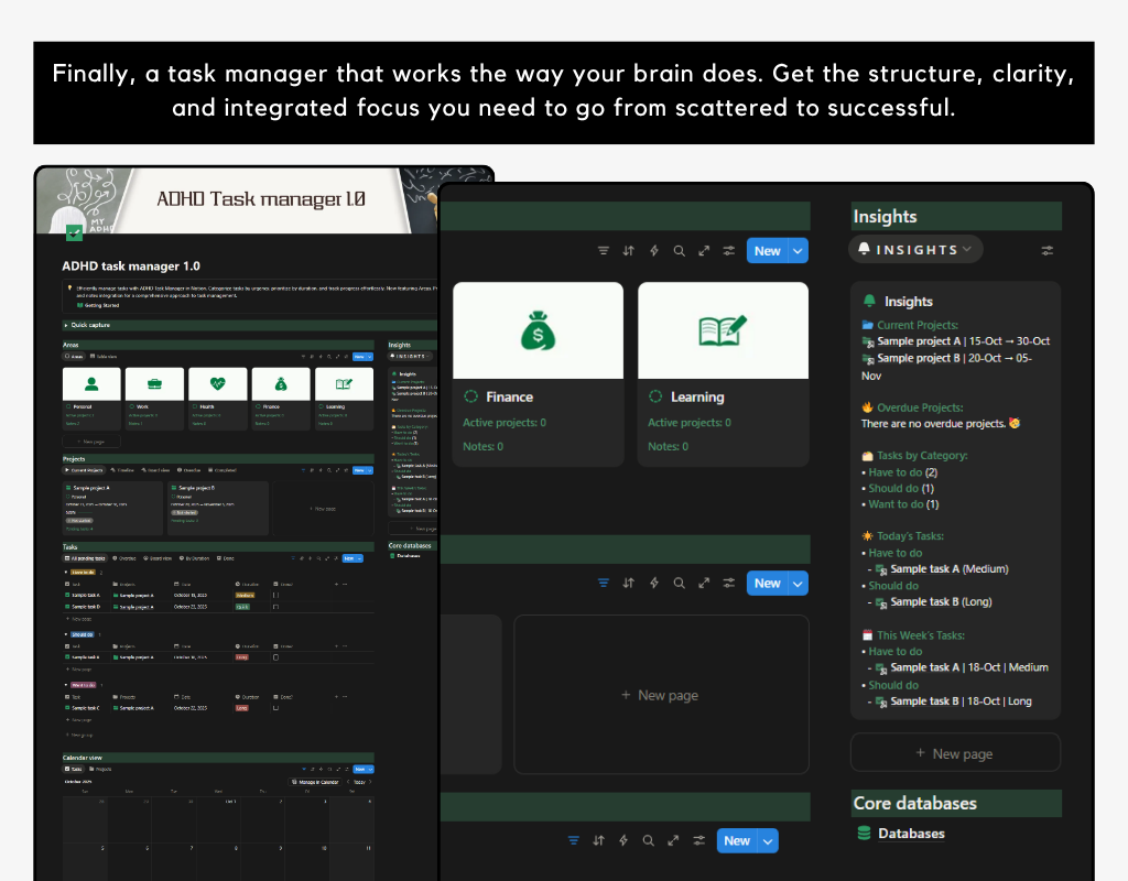 Designed specifically for the neurodivergent brain, the ADHD Task Manager 1.0 is a comprehensive Notion template that provides the clarity, structure, and organization you need to manage your life without the overwhelm. It helps you visualize your priorities, break down goals into manageable steps, and build focus through a system that works with your brain—not against it.