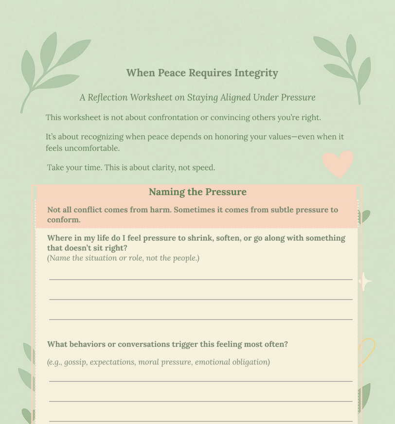When Peace Requires Integrity is a gentle reflection worksheet designed to help you recognize when inner peace depends on staying aligned with your values—even when doing so feels uncomfortable.