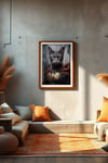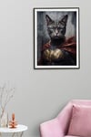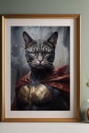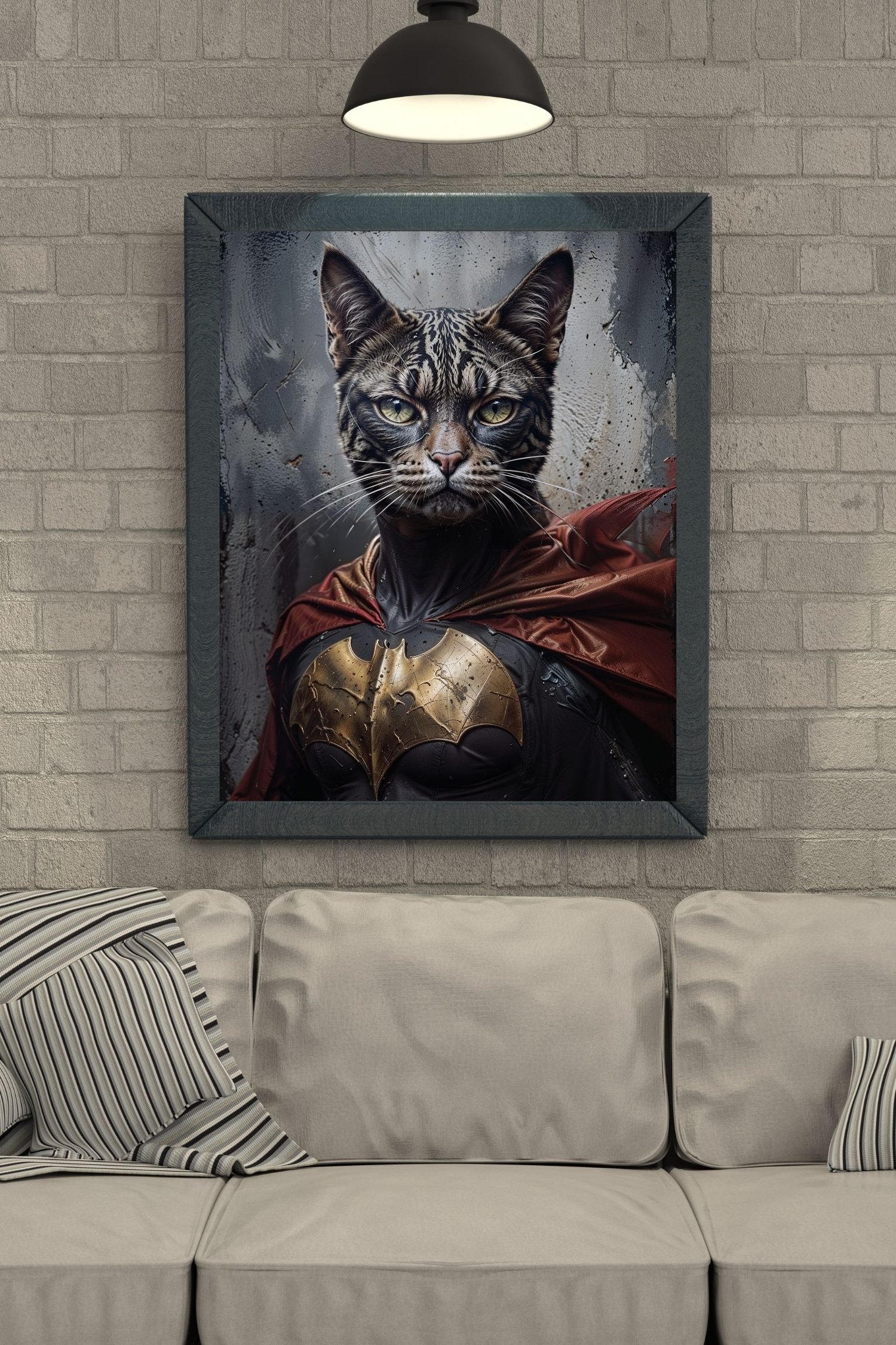 This bold and fearless digital artwork features a mighty cat dressed as a superhero, complete with a cape and golden chest emblem, radiating strength and loyalty. A perfect choice for cat lovers, superhero fans, or anyone looking to add a dramatic flair to their home, office, or creative space.