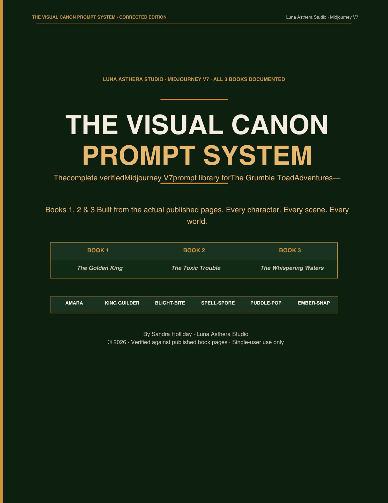 This is the Visual Canon Prompt System — the complete verified Midjourney V7 prompt library used to create The Grumble Toad Adventures, a 4-book children's fantasy series published on Amazon with professional ISBN distribution.