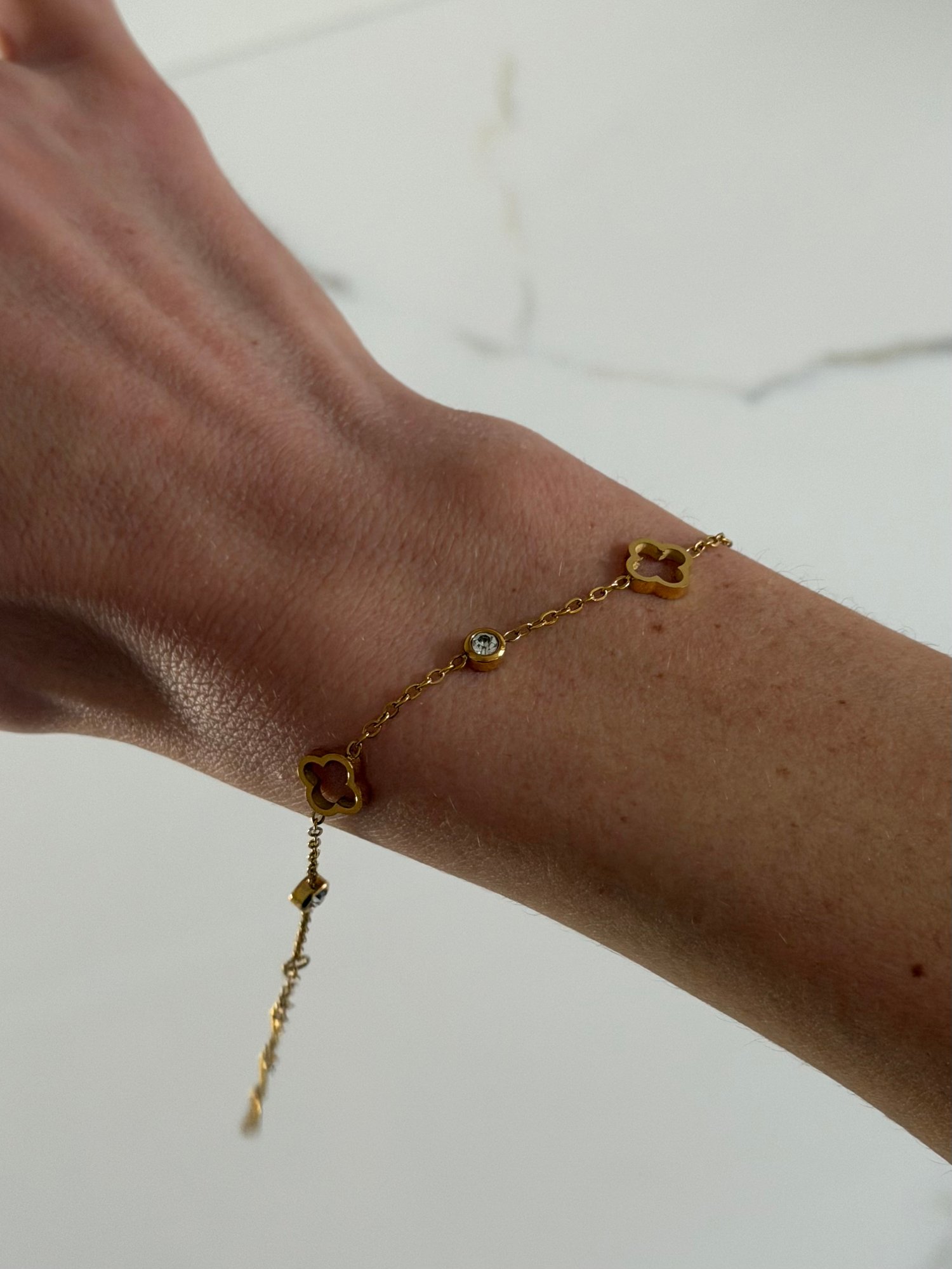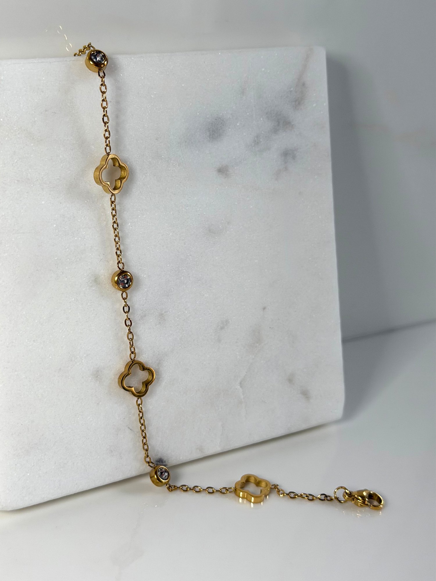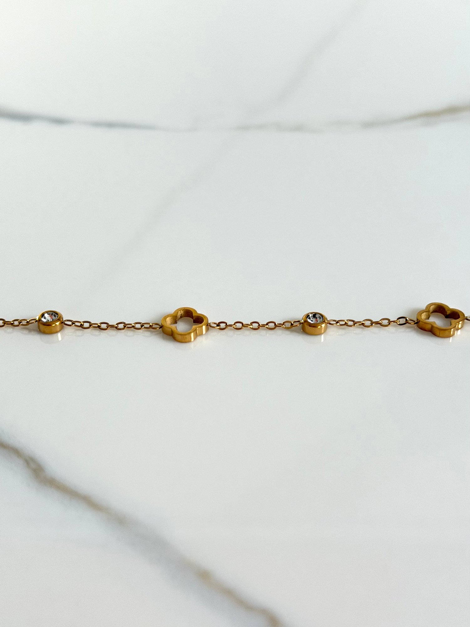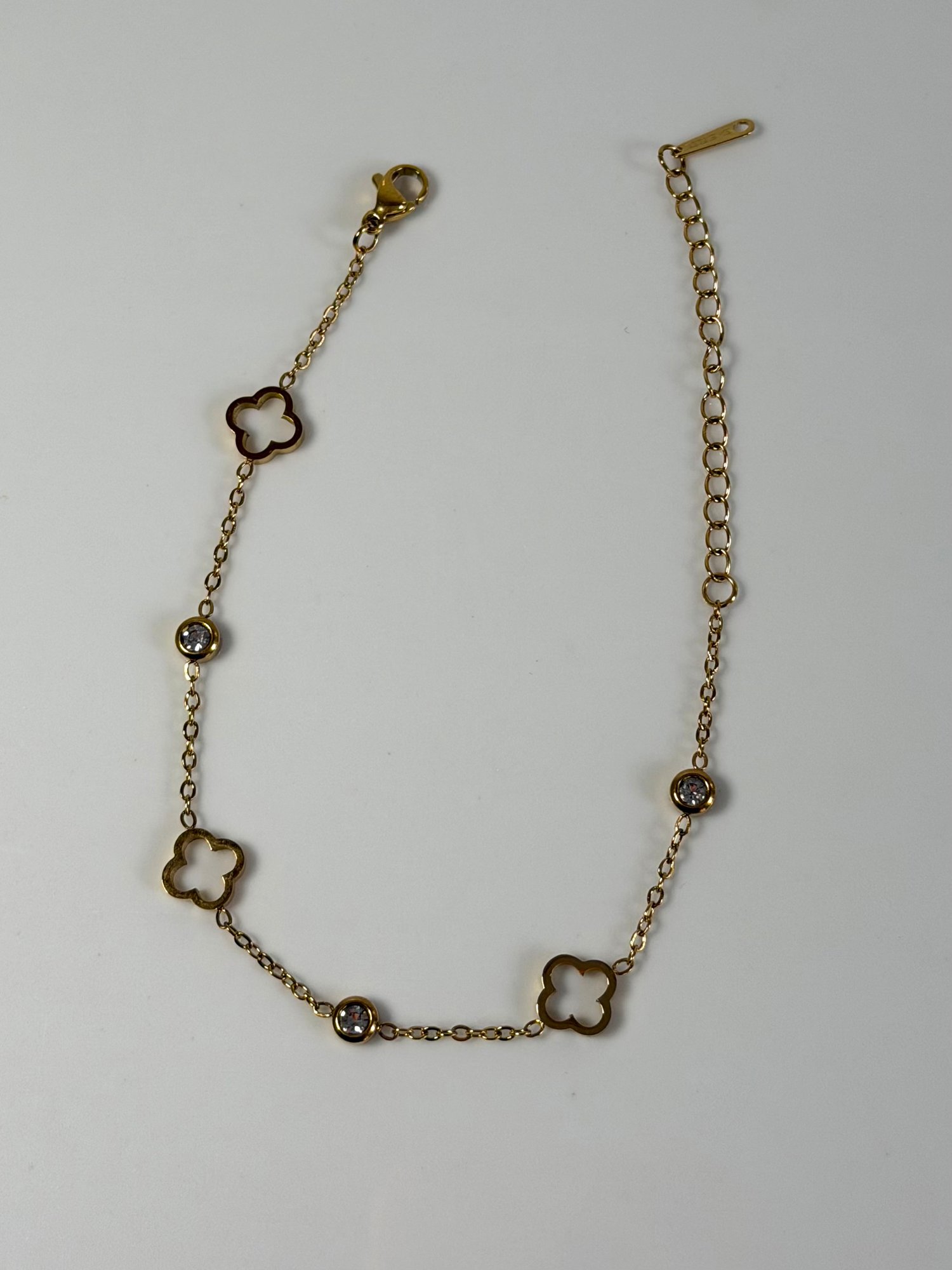 Bracelet fin et délicat avec motifs trèfle ajourés et strass.