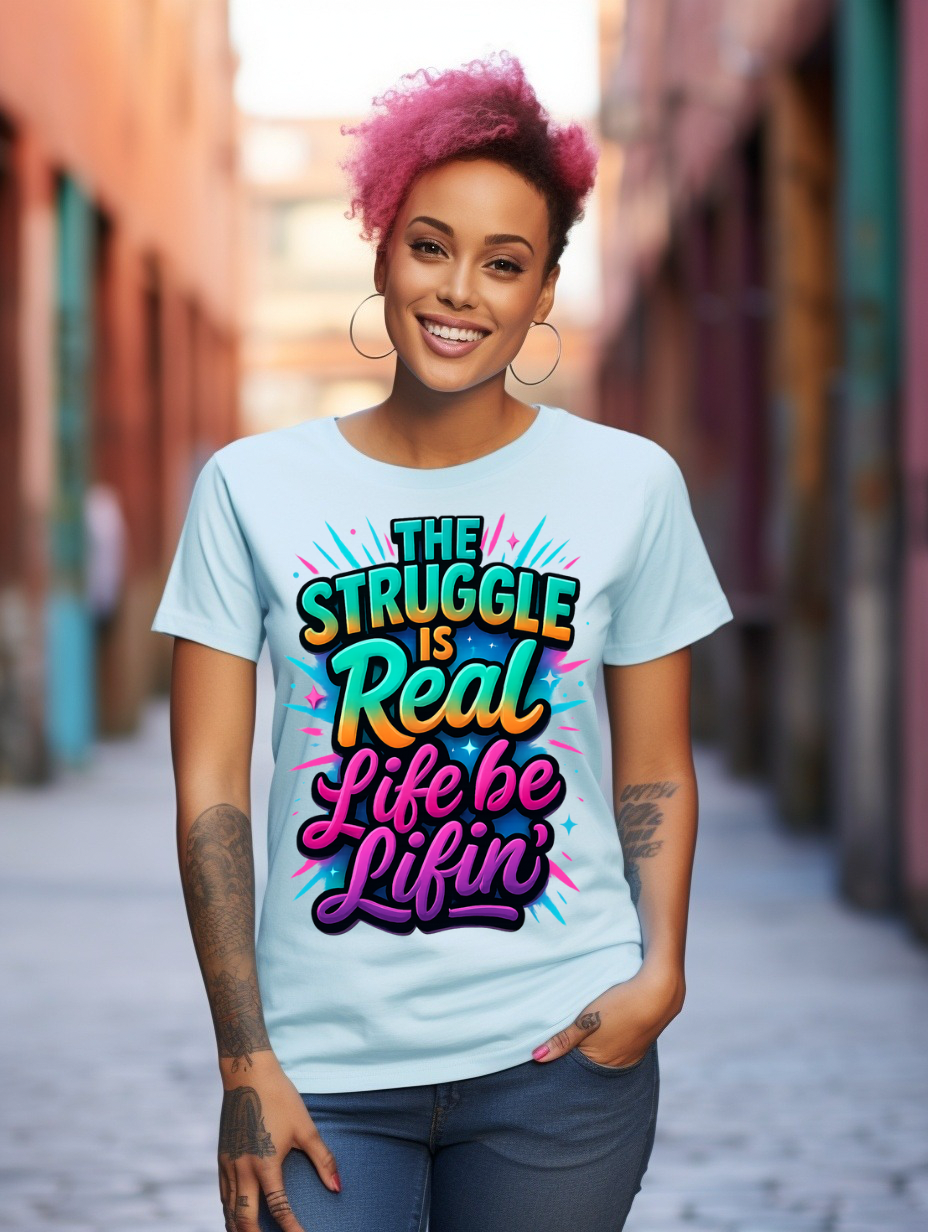 Life be life-in’ for real! This bold, urban, and vibrant gradient graffiti-style design says it all: The Struggle is Real. Life be Lifin’. Perfect for tees, tumblers, totes, and more when you need to express the daily grind in colorful style!