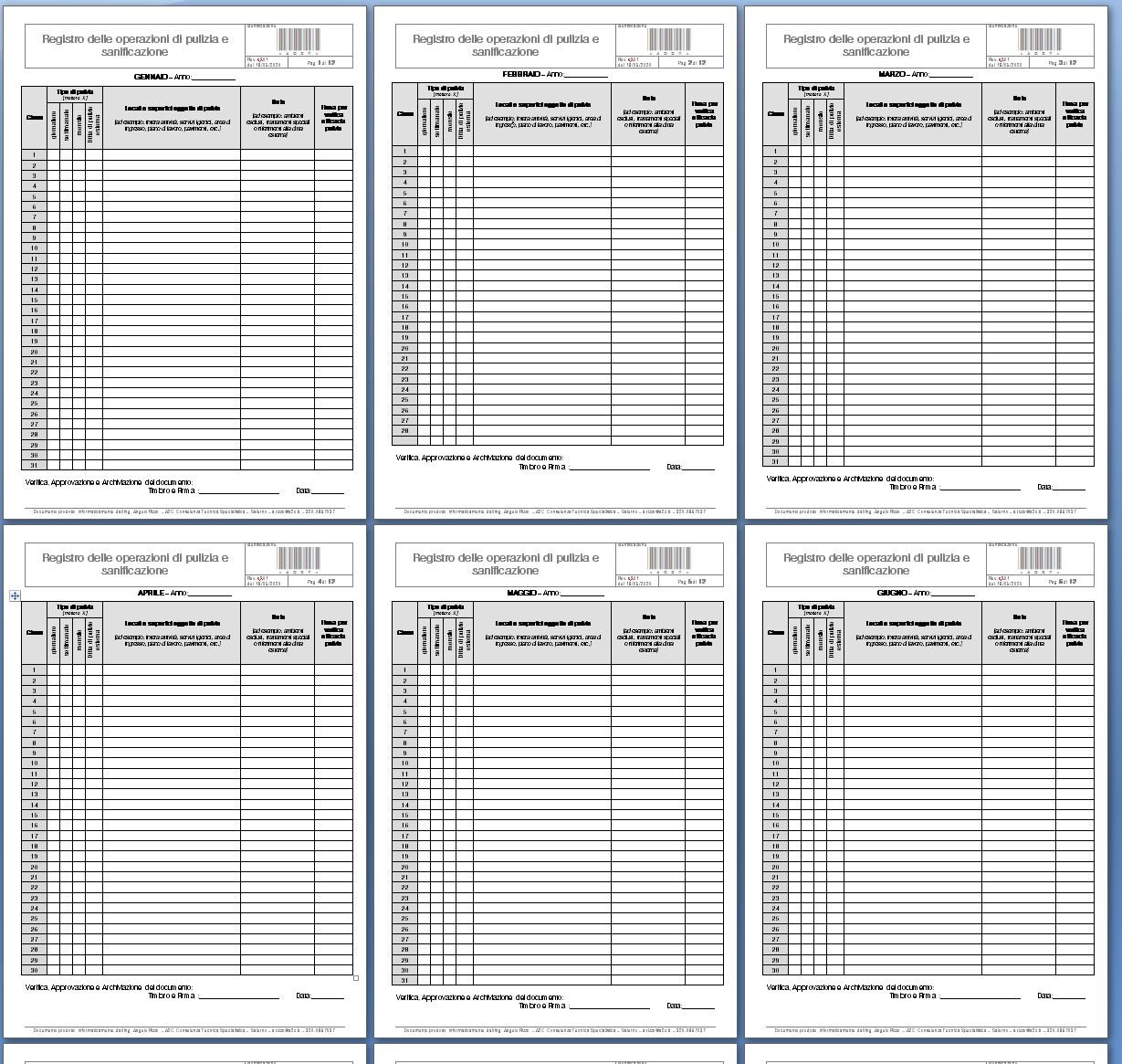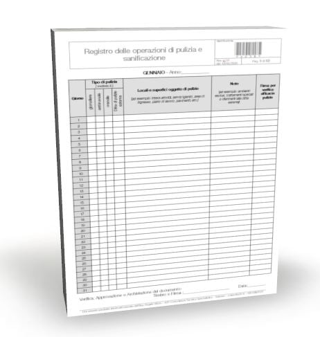 Il Registro delle operazioni di pulizia e sanificazione permette di tenere traccia delle attività svolte giornalmente. Il documento strutturato in formato A4 in n.12 pagine, su base mensile, consiste in una tabella in cui inserire per ogni giorno dell'anno le registrazioni delle pulizie effettuate, in modo particolare da renderle facilmente disponibili in caso di controllo delle Autorità.
