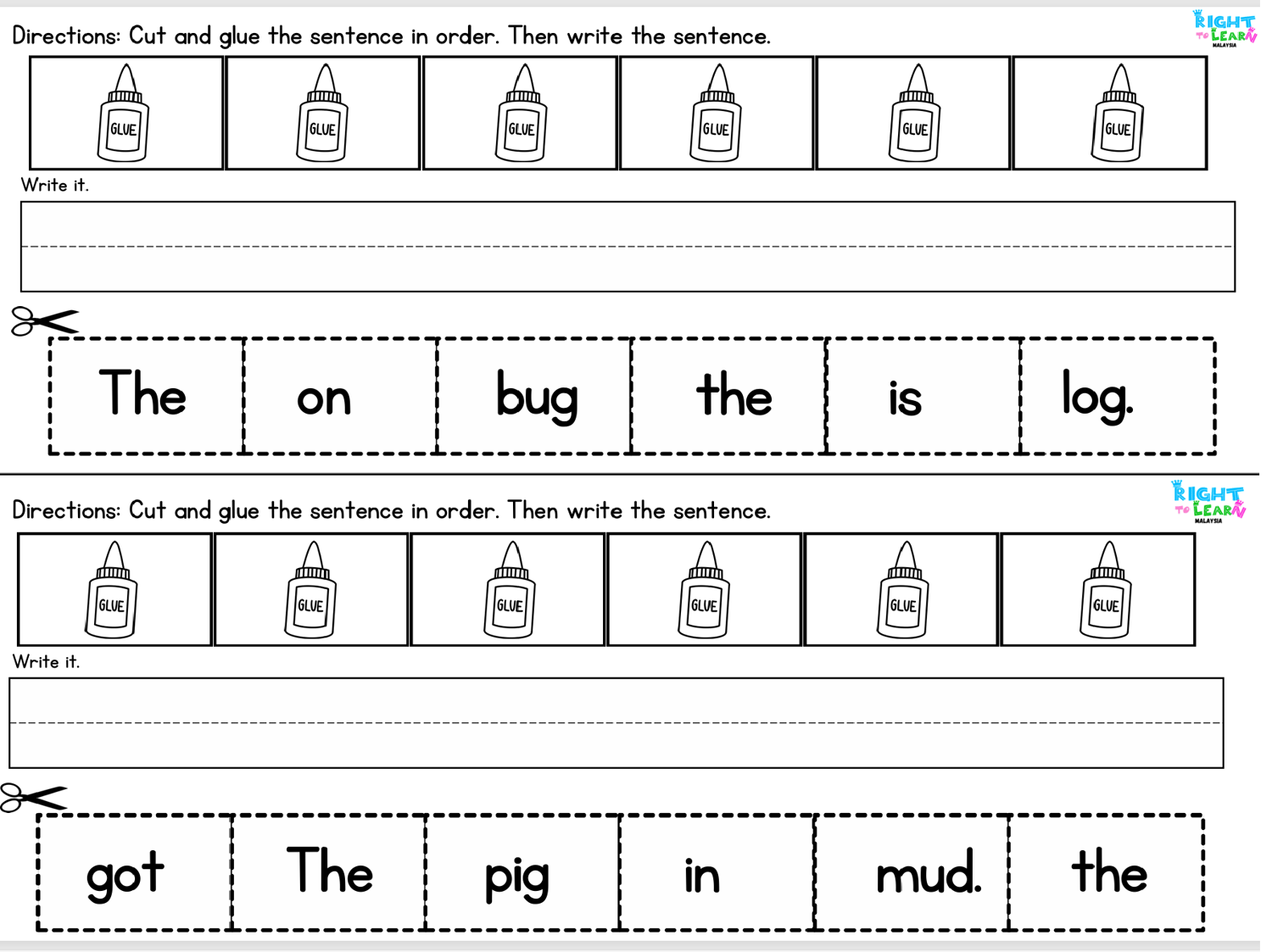 This book contains 30 cut and paste sentence building worksheets intended for use with children in Kindergarten (5/6 years old) & Primary 1 (7 year old )