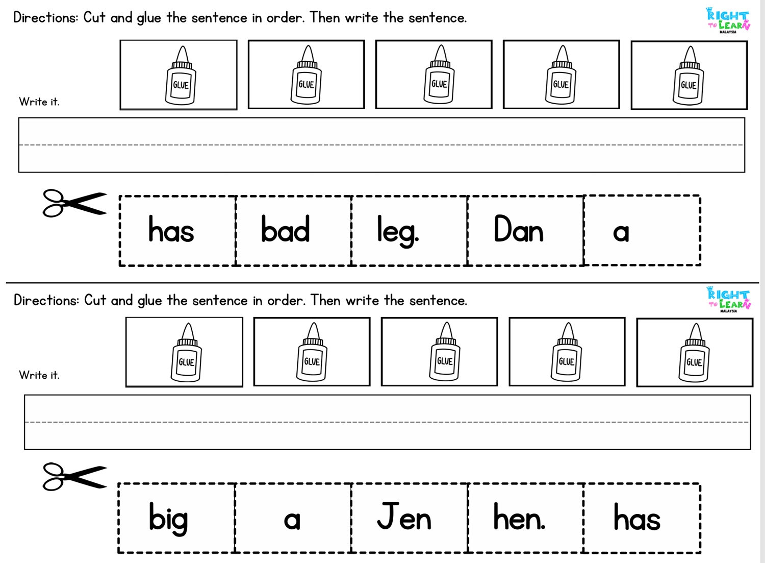 The worksheets in this packet include the following tasks: cutting and pasting word tiles in correct order to form the sentence at the top of the page, reading a sentence, writing the sentence on a handwriting line.