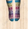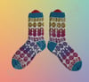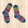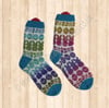 The charted pattern in this sock works well with a solid and a long gradient yarn (as in the pair pictured), or you could knit each motif band a separate solid color.