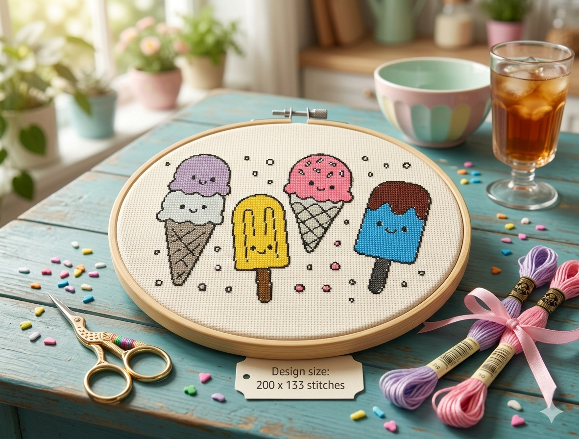 This cozy ice cream cross stitch pattern is a large, detailed design featuring cute, smiling ice cream treats inspired by a cozy coloring book illustration.