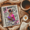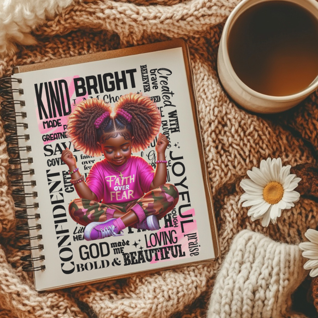 This bold and beautiful digital design features an Afro-American girl with curly hair, purple flower clips, and a confident glow, sitting peacefully in prayer. She wears a vibrant teal shirt with “Faith Over Fear” in pink and purple, surrounded by affirmations like “Confident,” “Joyful,” “Saved,” and “Beautiful.” Perfect for uplifting your journals, planners, notebook covers, or wall prints!