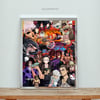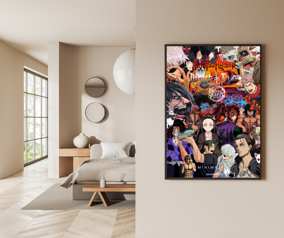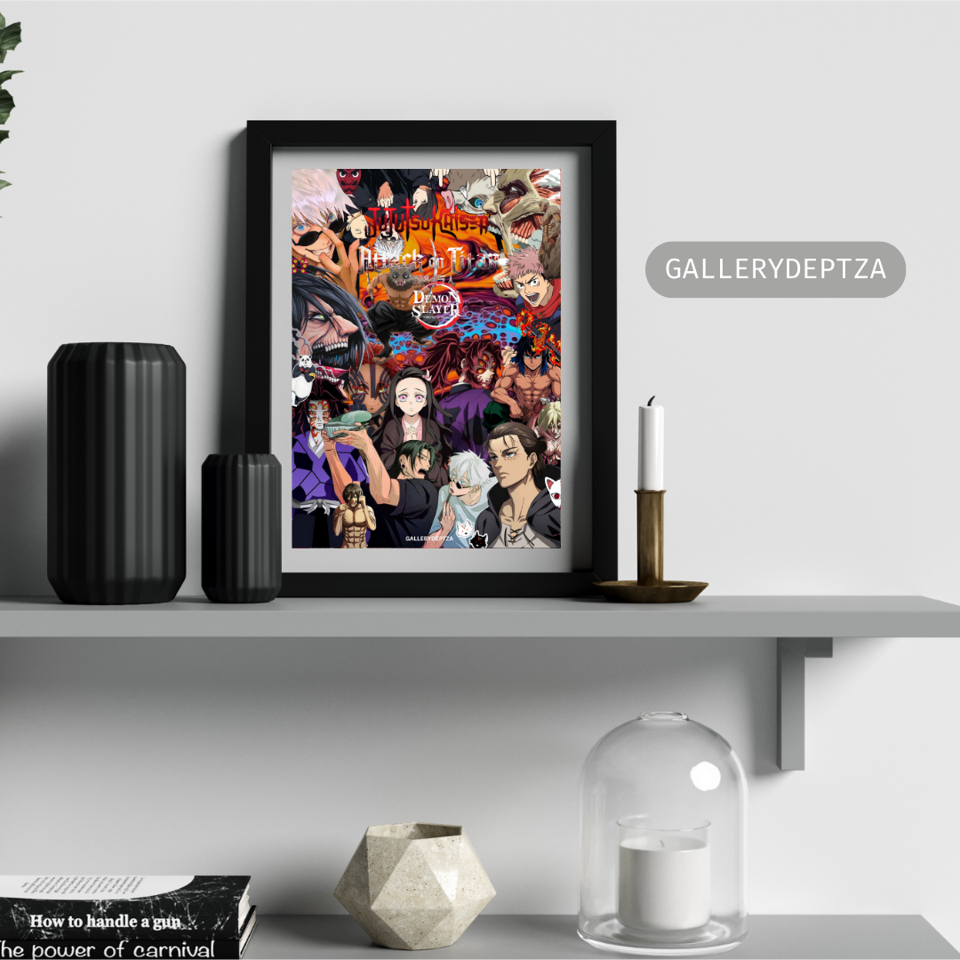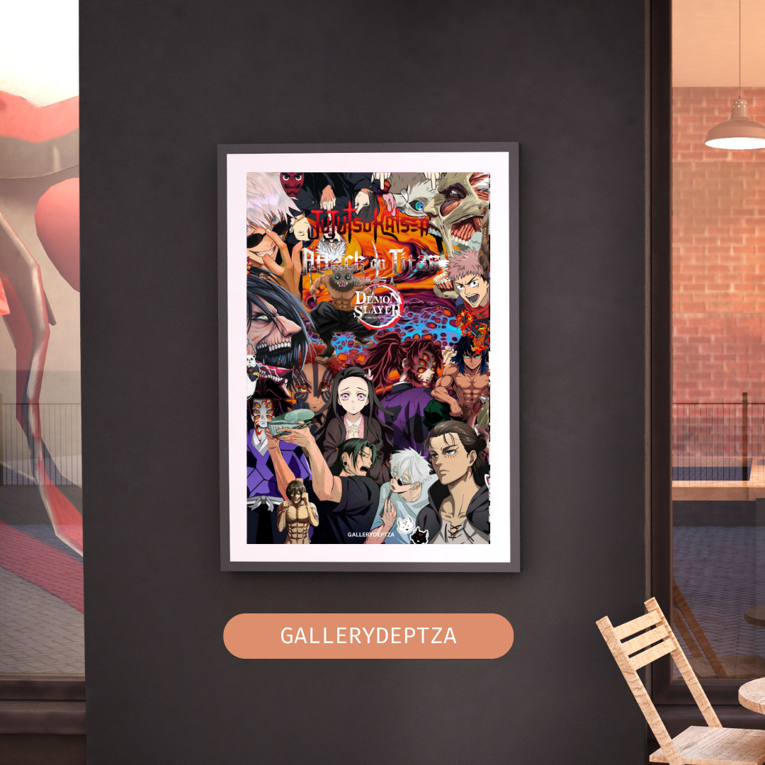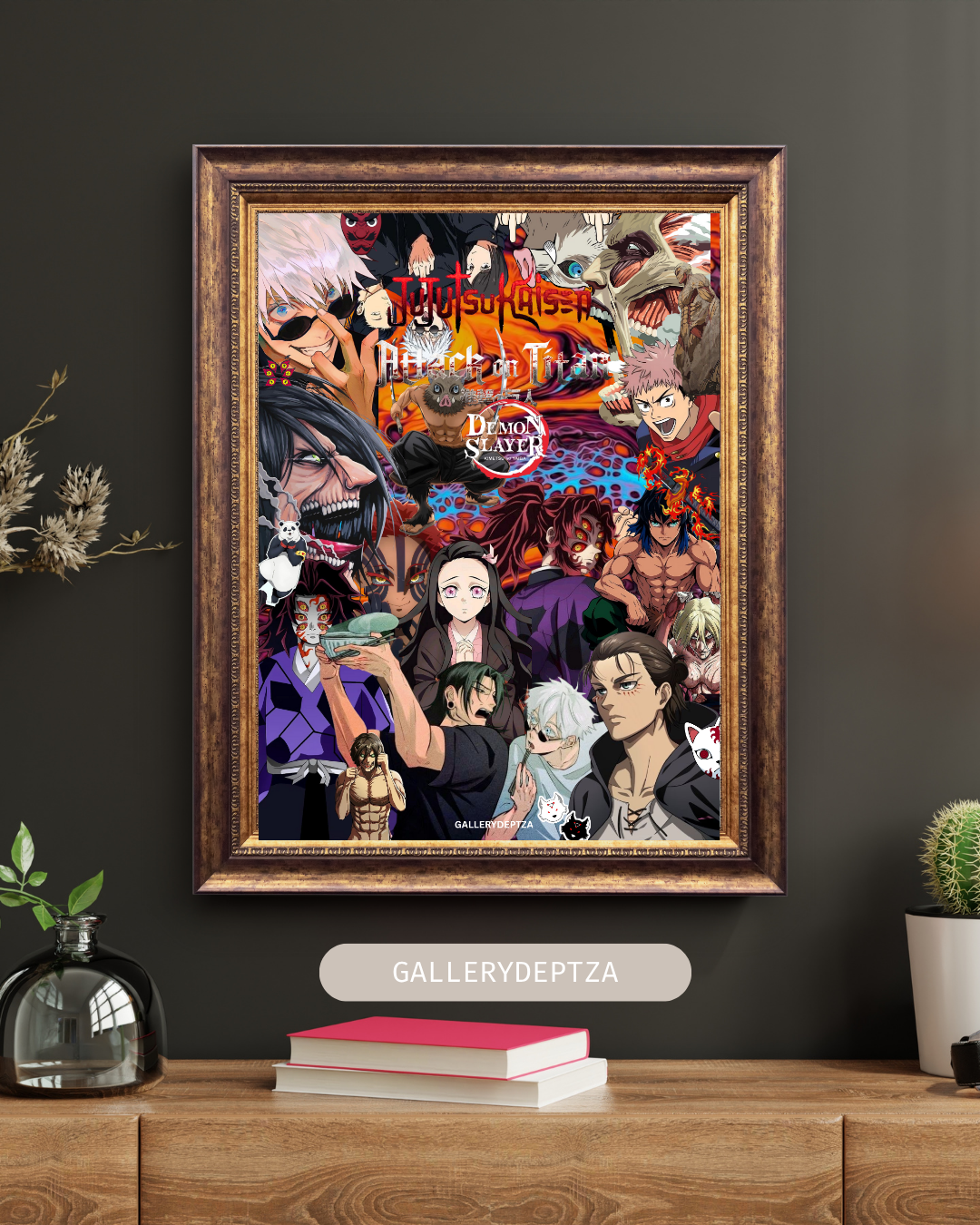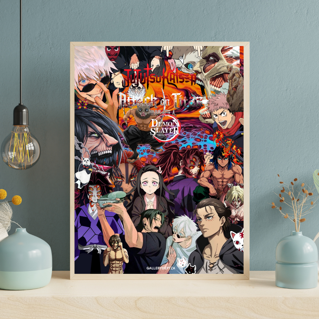 This JJK x AOT x Demon Slayer crossover digital print blends dynamic animated realism with cinematic flair — ideal for anime lovers, collectors, and anyone who lives for creative chaos.