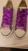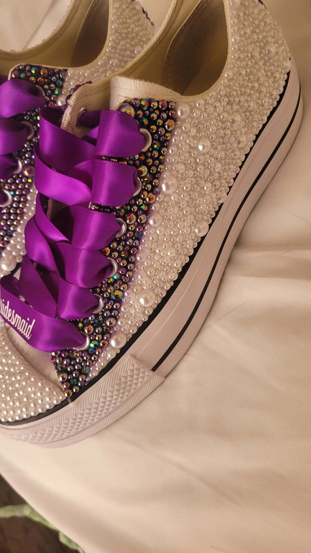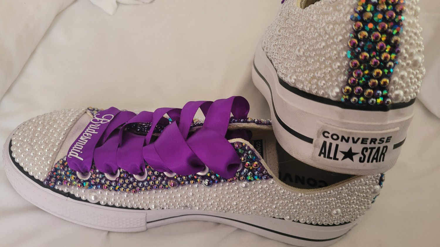 These customized Converse sneakers are perfect for a bridesmaid to be comfortable at the wedding. They can be worn with the wedding dress or at the reception so you can kick off your heels and party in comfort. The pearls and rhinestones mix come in the color of your choice. They would look great worn with a bridesmaid dress. Arrive for your friends or family wedding party in style. These shoes are made to order.