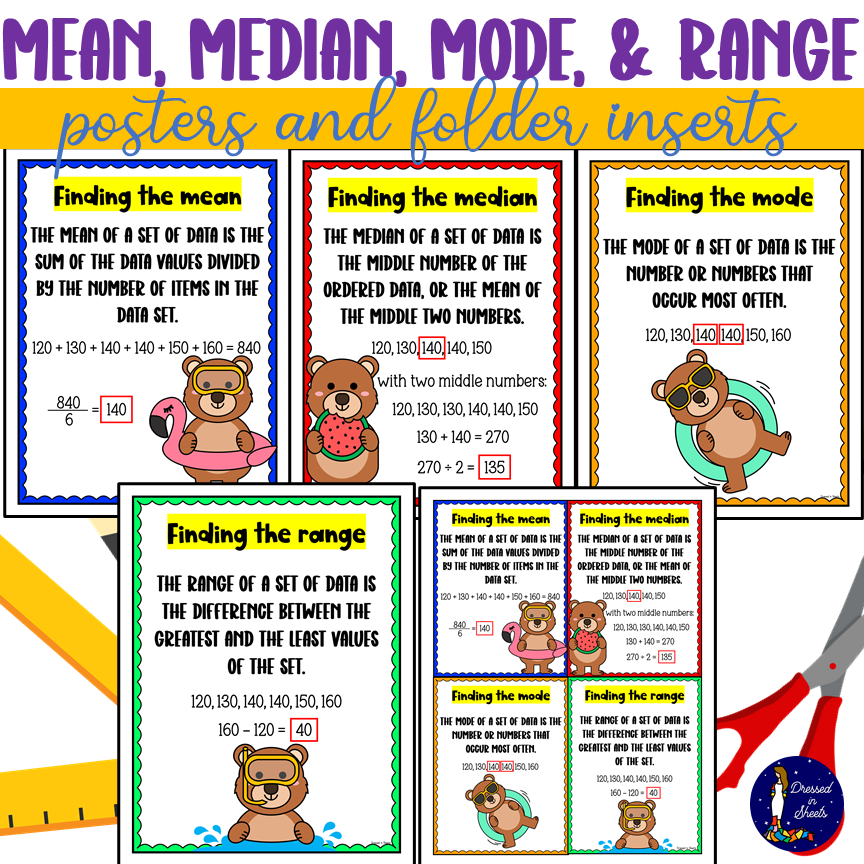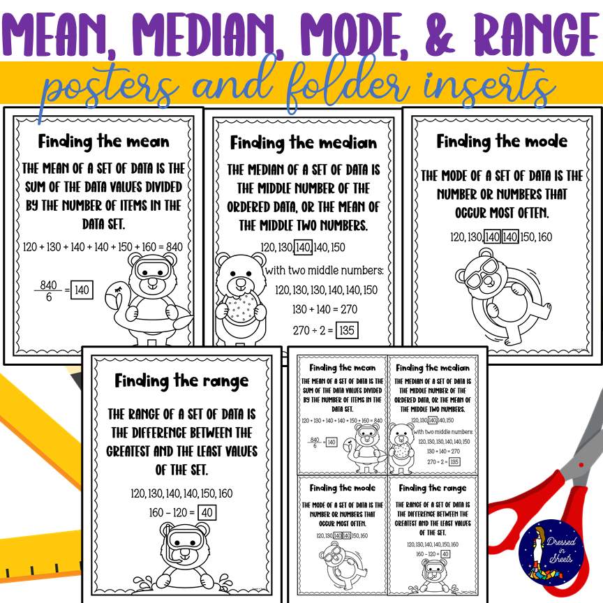 These set of posters in BOTH color and black and white will help your students when they are solving for mean, median, mode, and range. They explain the process to attain the answer for each and include examples on how to solve for each. As students use these posters to solve for mean, median, range, and/or mode they will remember how to perform each operation in the future.