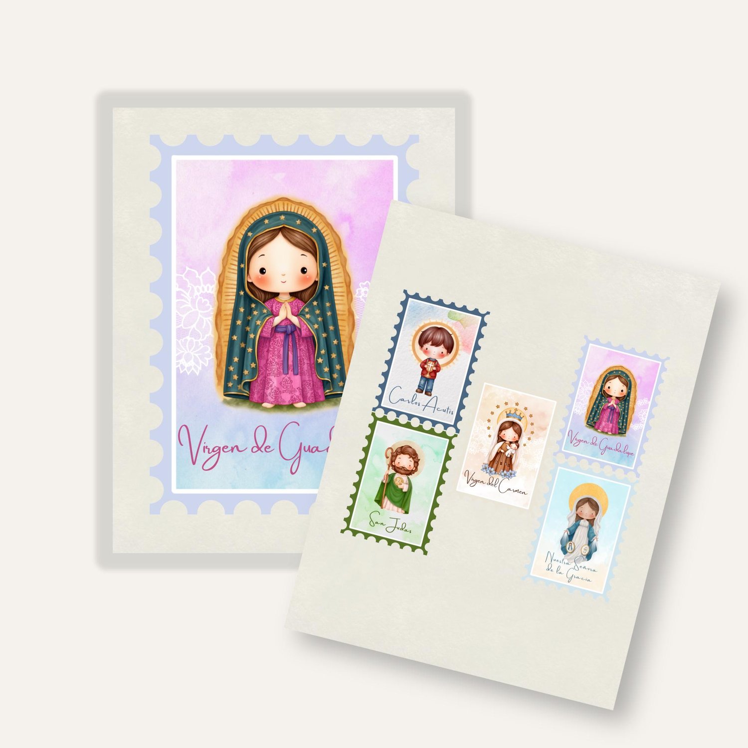 ¡Celebra la fe con este set exclusivo de 5 sellos postales digitales! Creado con un estilo tierno y amigable (kawaii), este kit de ilustraciones de San Judas, Carlo Acutis, Virgen de Guadalupe, Virgen Milagrosa y Virgen del Carmen es perfecto para dar un toque devocional a todos tus proyectos.