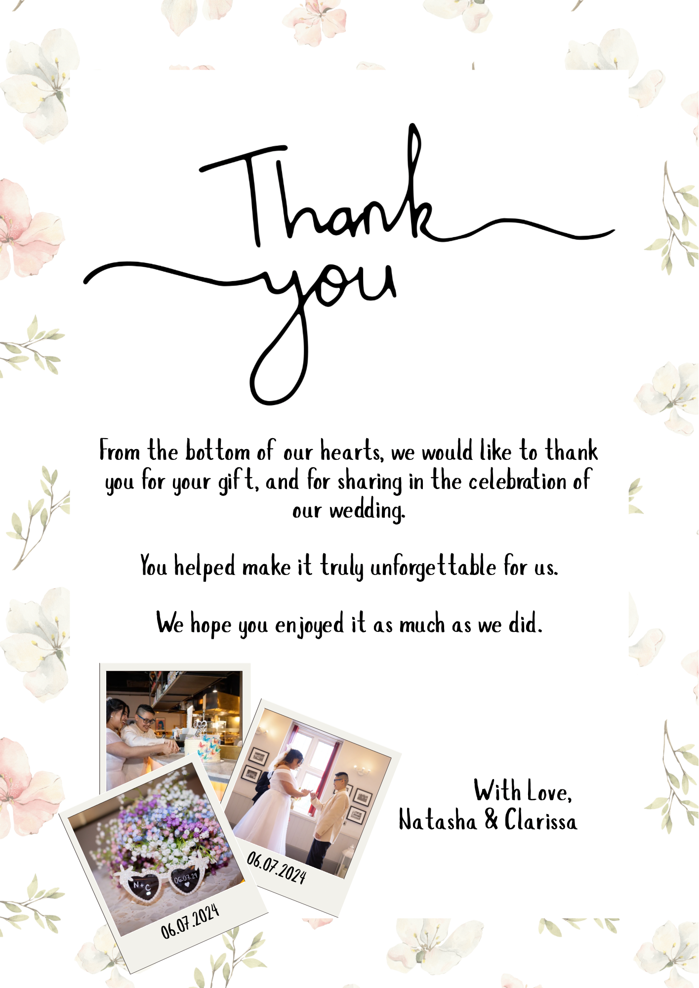 Send a heartfelt thank you in style with this elegant flower background thank you card, featuring your wedding initials, names, date, and two personal photos.