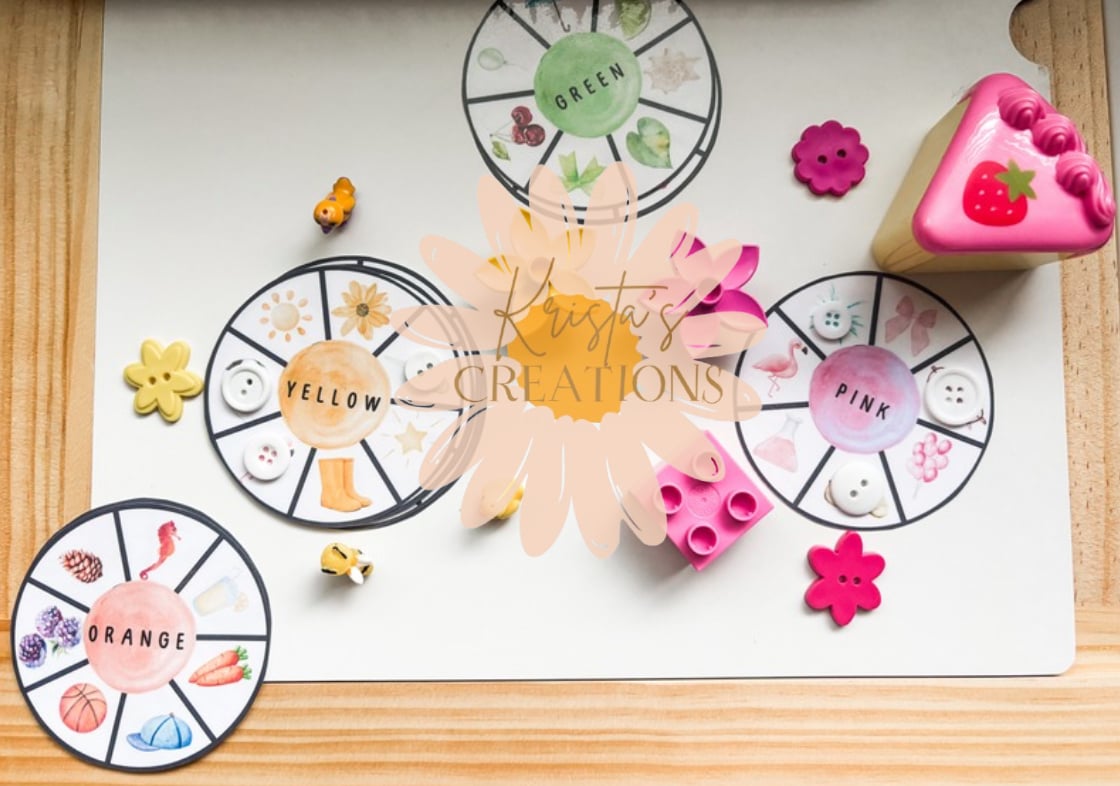Bring a splash of color to your learning with these engaging color identification wheels designed to help young learners practice color recognition. Each wheel features a single color and a variety of objects. Students examine the objects and place a marker (like a mini eraser, clothespin, or counter) on the ones that match the center color or cover the incorrectly colored objects.