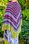 The large garter stitch stripes in bold contrasting colors are broken up by delicate lace sections. A contrasting border with a knotted fringe pays homage to Frida’s fringed shawls and adds a touch of whimsy.