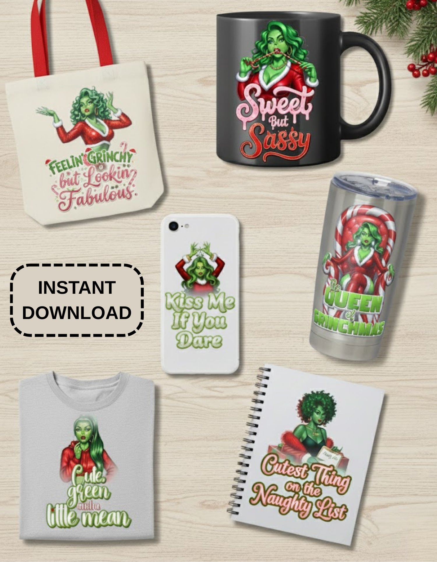 The Sassy Grinch Women Commercial PNG Bundle: A collection of 6 high-quality, glamorous female Grinch designs perfect for direct use on physical products like shirts, mugs, tumblers, and prints. All files are high-resolution PNGs with transparent backgrounds, ready for your Christmas craft and business projects. Commercial use license for physical products is included.