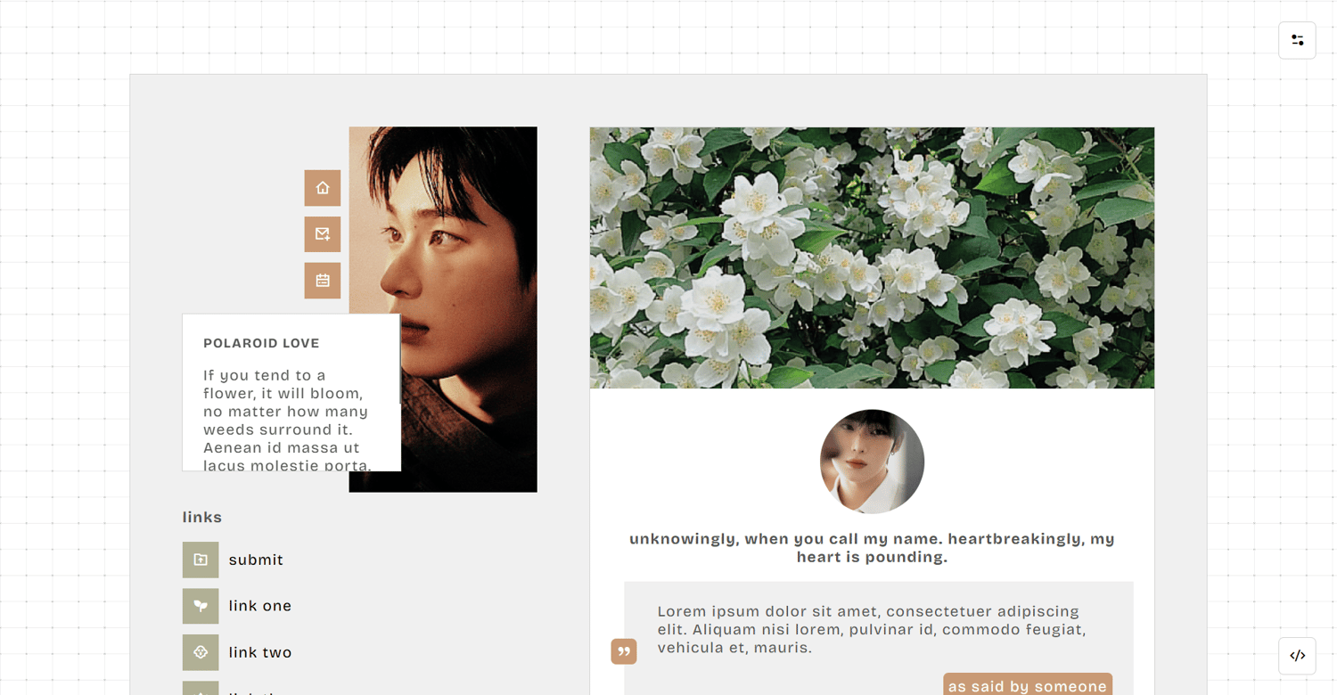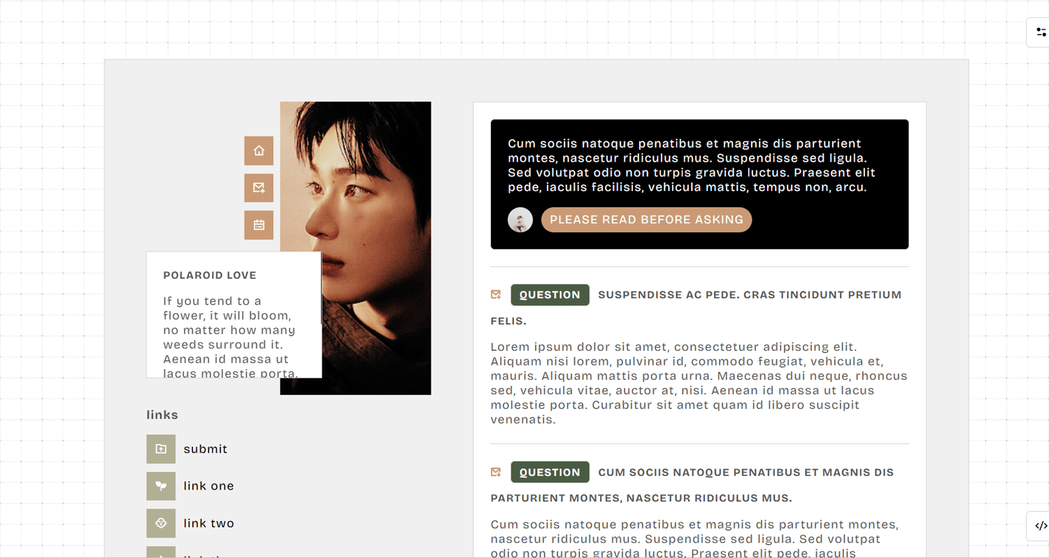 notes: please check your settings if you allow people to ask you questions or submit to you things. otherwise, your ask and submit links won’t show. npf posts friendly (+ among other things!). full credits to the resources, scripts and tutorials are found on the bottom right corner. if you found any coding bugs in my work, please send me a message. i will get back to your shortly.