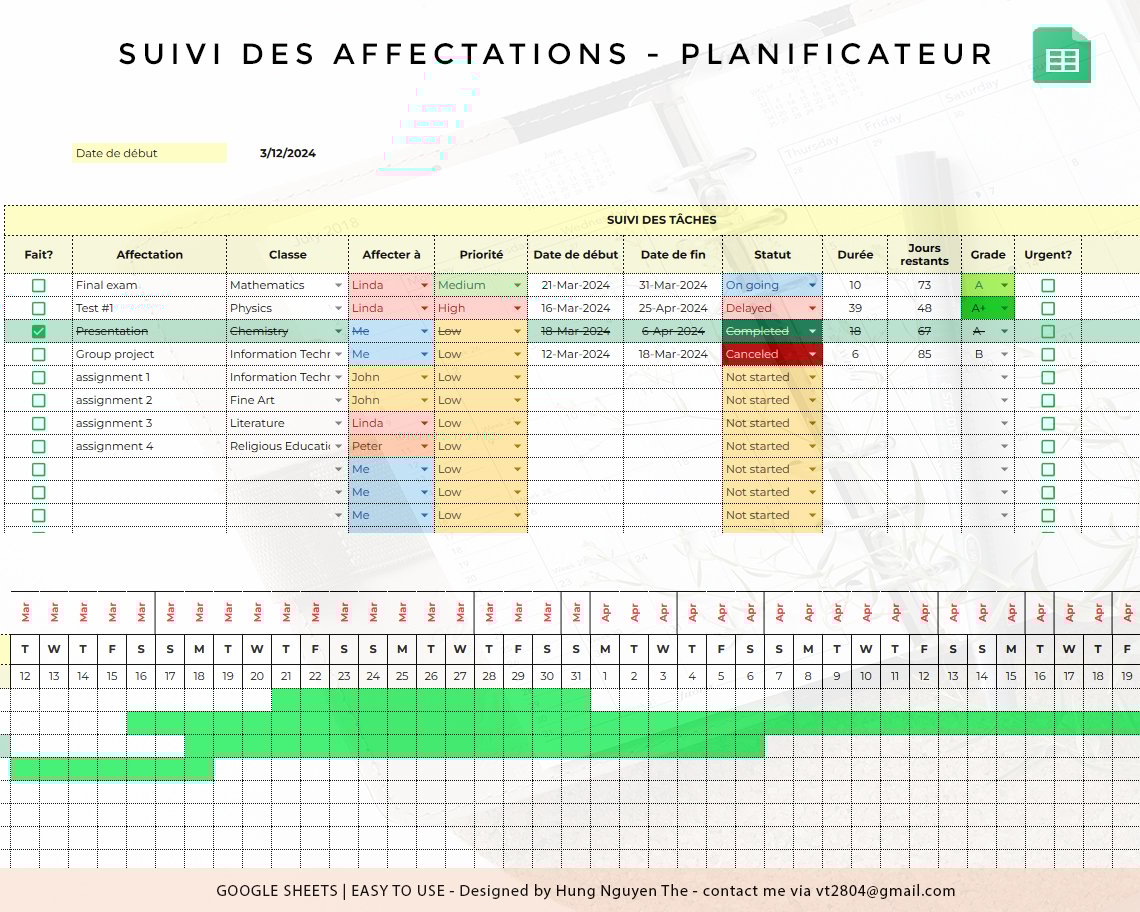 Suivi des devoirs des étudiants Planificateur de devoirs Google Sheets Excel 2024 Liste de tâches numérique Suivi des tâches universitaires Feuille de calcul du calendrier académique prenant en charge plusieurs langues - pour l'allemand