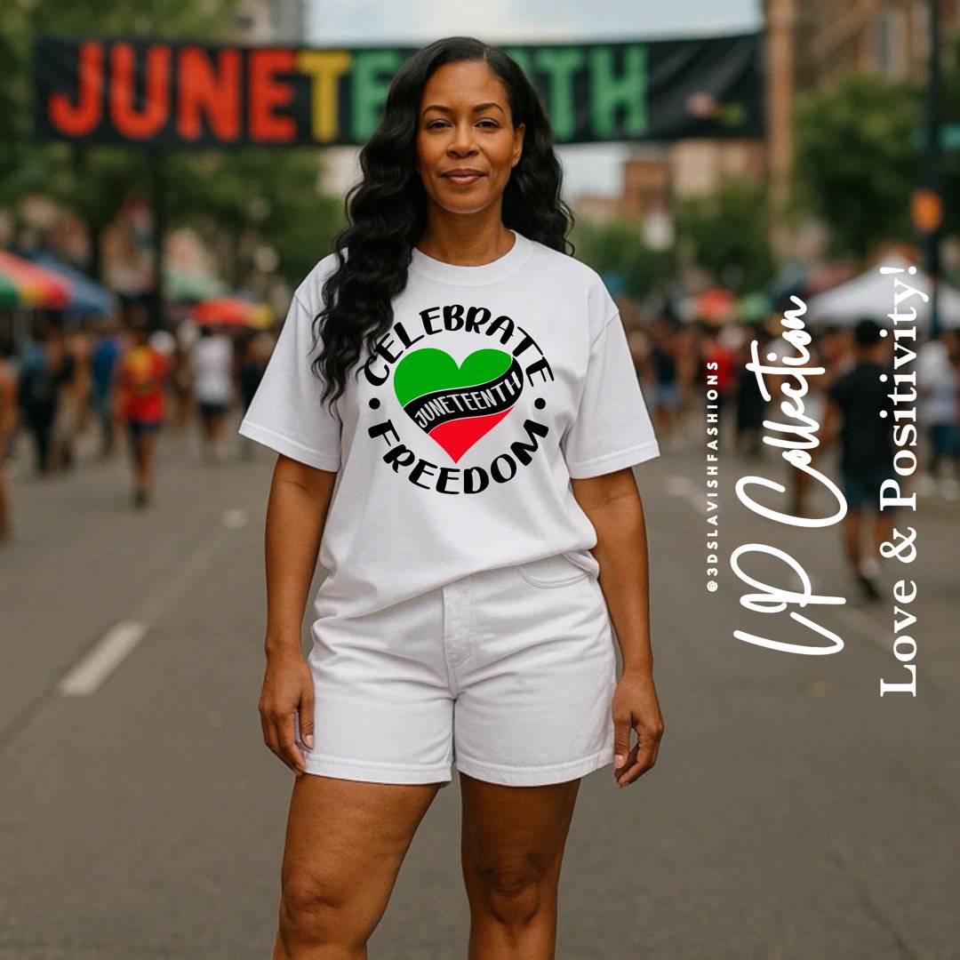Featuring bold Pan-African colors and a heart-shaped Juneteenth emblem, this tee speaks volumes without saying a word.