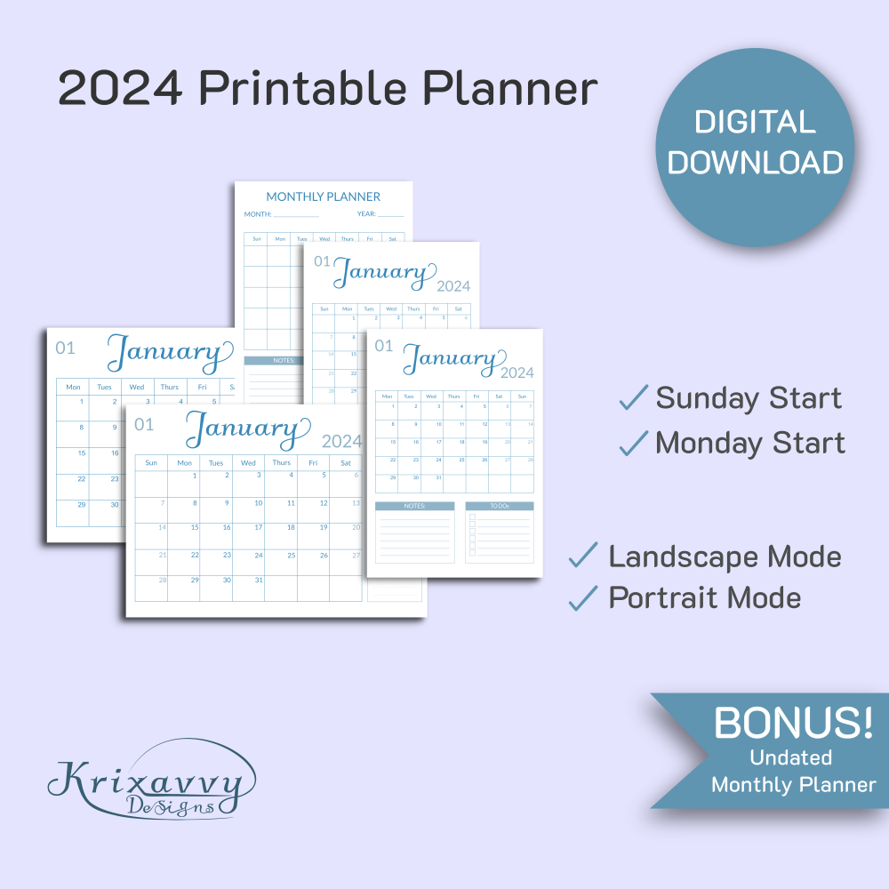 2024 Printable Monthly Planner (Sky blue color) with BLANK Undated Monthly Planner