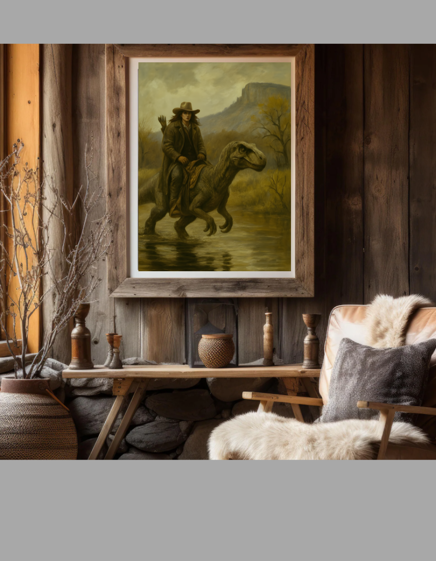 - Versatile Fantasy Art: Ideal for cowgirl nursery decor, rustic living rooms, or playful playrooms. Pairs beautifully with western dinosaur themes or vintage dino art collections.